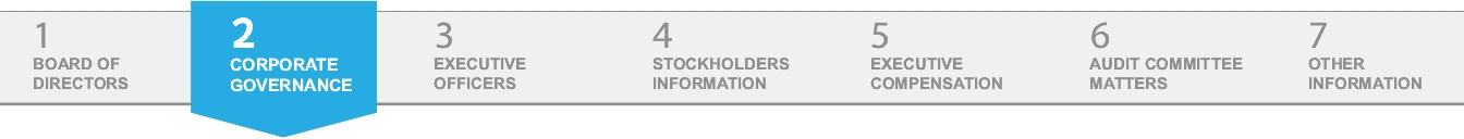 ✔ | Regular meetings of non-management, independent directors | ✔ | Robust Code of Conduct applicable to directors, officers, and employees | ||||||||