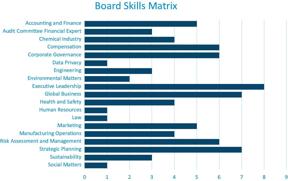 ![]() | DAVID A. BRADLEY Age: 55 Independent Director | David A. Bradley has served on our Board since April 2022. Since March 2019, Mr. Bradley has served as the President and Chief Executive Officer and member of the board of directors of SI Group. Prior to joining SI Group, Mr. Bradley served as President and Chief Executive Officer and member of the board of directors of Nexeo Solutions between 2011 and 2019. Prior to that, Mr. Bradley spent seven years at Kraton Corporation, where he held several executive positions, including Chief Operating Officer, Vice President of Global Operations, and Vice President of Business Transformation. Since 2019, he also has been a member of the board of directors of South Texas Truck Centers LLP. Mr. Bradley is well qualified to serve on our Board and he was re-nominated to serve on the Board for election at this Annual Meeting because of his extensive experience in the chemicals sector and his extensive management and leadership experience. | ||||