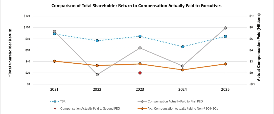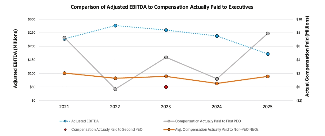 Year | Summary Compensation Table Total for First PEO(1) | Summary Compensation Table Total for Second PEO(1) | Compensation Actually Paid to First PEO(1)(2) | Compensation Actually Paid to Second PEO(1)(2) | Average Summary Compensation Table Total for Non-PEO NEOs(3) | Average Compensation Actually Paid to Non-PEO NEOs(2)(3) | Value of Initial Fixed $100 Investment Based On:(4) | Net Income ($ Thousands) | Adjusted EBITDA ($ Thousands) | |||||||||||||||||||||||