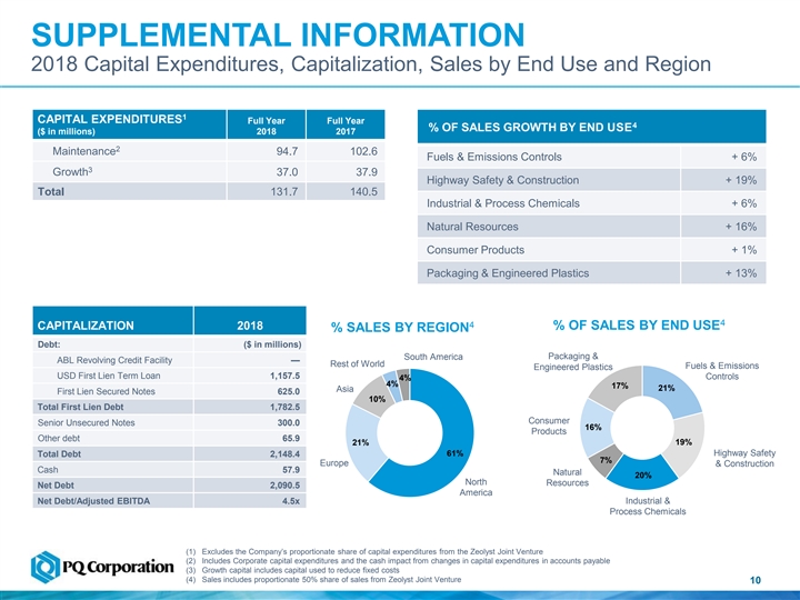 SUPPLEMENTAL INFORMATION 2018 Capital Expenditures, Capitalization, Sales by End Use and Region 1 CAPITAL EXPENDITURES Full Year Full Year 4 % OF SALES GROWTH BY END USE ($ in millions) 2018 2017 2 Maintenance 94.7 102.6 Fuels & Emissions Controls + 6% 3 Growth 37.0 37.9 Highway Safety & Construction + 19% Total 131.7 140.5 Industrial & Process Chemicals + 6% Natural Resources + 16% Consumer Products + 1% Packaging & Engineered Plastics + 13% 4 4 CAPITALIZATION 2018 % OF SALES BY END USE % SALES BY REGION Debt: ($ in millions) Packaging & South America ABL Revolving Credit Facility— Rest of World Fuels & Emissions Engineered Plastics USD First Lien Term Loan 1,157.5 Controls 4% 4% 17% 21% Asia First Lien Secured Notes 625.0 10% Total First Lien Debt 1,782.5 Consumer Senior Unsecured Notes 300.0 16% Products Other debt 65.9 21% 19% Total Debt 2,148.4 61% Highway Safety 7% Europe & Construction Cash 57.9 Natural 20% North Resources Net Debt 2,090.5 America Industrial & Net Debt/Adjusted EBITDA 4.5x Process Chemicals (1) Excludes the Company’s proportionate share of capital expenditures from the Zeolyst Joint Venture (2) Includes Corporate capital expenditures and the cash impact from changes in capital expenditures in accounts payable (3) Growth capital includes capital used to reduce fixed costs (4) Sales includes proportionate 50% share of sales from Zeolyst Joint Venture 10SUPPLEMENTAL INFORMATION 2018 Capital Expenditures, Capitalization, Sales by End Use and Region 1 CAPITAL EXPENDITURES Full Year Full Year 4 % OF SALES GROWTH BY END USE ($ in millions) 2018 2017 2 Maintenance 94.7 102.6 Fuels & Emissions Controls + 6% 3 Growth 37.0 37.9 Highway Safety & Construction + 19% Total 131.7 140.5 Industrial & Process Chemicals + 6% Natural Resources + 16% Consumer Products + 1% Packaging & Engineered Plastics + 13% 4 4 CAPITALIZATION 2018 % OF SALES BY END USE % SALES BY REGION Debt: ($ in millions) Packaging & South America ABL Revolving Credit Facility— Rest of World Fuels & Emissions Engineered Plastics USD First Lien Term Loan 1,157.5 Controls 4% 4% 17% 21% Asia First Lien Secured Notes 625.0 10% Total First Lien Debt 1,782.5 Consumer Senior Unsecured Notes 300.0 16% Products Other debt 65.9 21% 19% Total Debt 2,148.4 61% Highway Safety 7% Europe & Construction Cash 57.9 Natural 20% North Resources Net Debt 2,090.5 America Industrial & Net Debt/Adjusted EBITDA 4.5x Process Chemicals (1) Excludes the Company’s proportionate share of capital expenditures from the Zeolyst Joint Venture (2) Includes Corporate capital expenditures and the cash impact from changes in capital expenditures in accounts payable (3) Growth capital includes capital used to reduce fixed costs (4) Sales includes proportionate 50% share of sales from Zeolyst Joint Venture 10