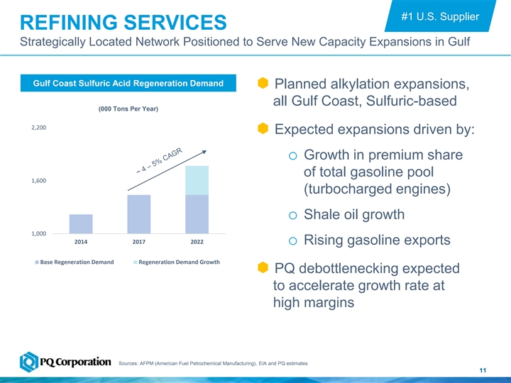#1 U.S. Supplier REFINING SERVICES Strategically Located Network Positioned to Serve New Capacity Expansions in Gulf Gulf Coast Sulfuric Acid Regeneration Demand Planned alkylation expansions, all Gulf Coast, Sulfuric-based (000 Tons Per Year) 2,200 Expected expansions driven by: o Growth in premium share of total gasoline pool 1,600 (turbocharged engines) o Shale oil growth 1,000 2014 2017 2022 o Rising gasoline exports Base Regeneration Demand Regeneration Demand Growth PQ debottlenecking expected to accelerate growth rate at high margins Sources: AFPM (American Fuel Petrochemical Manufacturing), EIA and PQ estimates 11#1 U.S. Supplier REFINING SERVICES Strategically Located Network Positioned to Serve New Capacity Expansions in Gulf Gulf Coast Sulfuric Acid Regeneration Demand Planned alkylation expansions, all Gulf Coast, Sulfuric-based (000 Tons Per Year) 2,200 Expected expansions driven by: o Growth in premium share of total gasoline pool 1,600 (turbocharged engines) o Shale oil growth 1,000 2014 2017 2022 o Rising gasoline exports Base Regeneration Demand Regeneration Demand Growth PQ debottlenecking expected to accelerate growth rate at high margins Sources: AFPM (American Fuel Petrochemical Manufacturing), EIA and PQ estimates 11