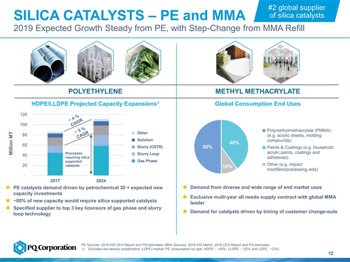 #2 global supplier of silica catalysts SILICA CATALYSTS – PE and MMA 2019 Expected Growth Steady from PE, with Step-Change from MMA Refill POLYETHYLENE METHYL METHACRYLATE 1 HDPE/LLDPE Projected Capacity Expansions Global Consumption End Uses 120 100 Polymethylmethacrylate (PMMA) Other 80 (e.g. acrylic sheets, molding Solution compounds) 40% 60 Slurry (CSTR) 50% Paints & Coatings (e.g. household acrylic paints, coatings and Processes Slurry Loop 40 requiring silica adhesives) Gas Phase supported Other (e.g. impact 20 catalysts 10% modifiers/processing aids) - 2017 2024 Demand from diverse and wide range of end market uses PE catalysts demand driven by petrochemical 30 + expected new capacity investments Exclusive multi-year all needs supply contract with global MMA ~80% of new capacity would require silica supported catalysts leader Specified supplier to top 3 key licensors of gas phase and slurry Demand for catalysts driven by timing of customer change-outs loop technology PE Sources: 2018 IHS CEH Report and PQ estimates; MMA Sources: 2018 IHS Markit, 2016 CEH Report and PQ estimates 1) Excludes low-density polyethylene (LDPE) market; PE consumption by type: HDPE – ~45%, LLDPE - ~32% and LDPE - ~23% 12 12 Million MT#2 global supplier of silica catalysts SILICA CATALYSTS – PE and MMA 2019 Expected Growth Steady from PE, with Step-Change from MMA Refill POLYETHYLENE METHYL METHACRYLATE 1 HDPE/LLDPE Projected Capacity Expansions Global Consumption End Uses 120 100 Polymethylmethacrylate (PMMA) Other 80 (e.g. acrylic sheets, molding Solution compounds) 40% 60 Slurry (CSTR) 50% Paints & Coatings (e.g. household acrylic paints, coatings and Processes Slurry Loop 40 requiring silica adhesives) Gas Phase supported Other (e.g. impact 20 catalysts 10% modifiers/processing aids) - 2017 2024 Demand from diverse and wide range of end market uses PE catalysts demand driven by petrochemical 30 + expected new capacity investments Exclusive multi-year all needs supply contract with global MMA ~80% of new capacity would require silica supported catalysts leader Specified supplier to top 3 key licensors of gas phase and slurry Demand for catalysts driven by timing of customer change-outs loop technology PE Sources: 2018 IHS CEH Report and PQ estimates; MMA Sources: 2018 IHS Markit, 2016 CEH Report and PQ estimates 1) Excludes low-density polyethylene (LDPE) market; PE consumption by type: HDPE – ~45%, LLDPE - ~32% and LDPE - ~23% 12 12 Million MT