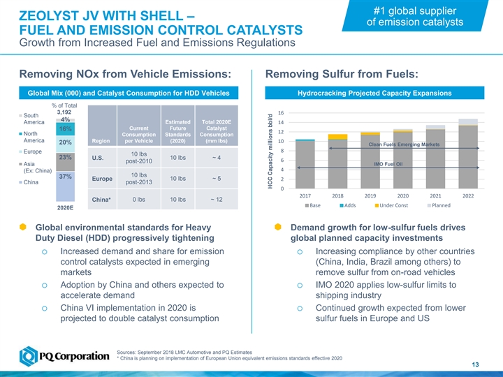 #1 global supplier ZEOLYST JV WITH SHELL – of emission catalysts FUEL AND EMISSION CONTROL CATALYSTS Growth from Increased Fuel and Emissions Regulations Removing NOx from Vehicle Emissions: Removing Sulfur from Fuels: Global Mix (000) and Catalyst Consumption for HDD Vehicles Hydrocracking Projected Capacity Expansions % of Total 3,192 16 South 4% Estimated Total 2020E America 14 Current Future Catalyst 16% 12 North Consumption Standards Consumption America Region per Vehicle (2020) (mm lbs) 10 20% Clean Fuels Emerging Markets 8 Europe 10 lbs 23% U.S. 10 lbs ~ 4 6 post-2010 Asia IMO Fuel Oil 4 (Ex: China) 10 lbs 37% Europe 10 lbs ~ 5 2 China post-2013 0 2017 2018 2019 2020 2021 2022 China* 0 lbs 10 lbs ~ 12 Base Adds Under Const Planned 2020E Global environmental standards for Heavy Demand growth for low-sulfur fuels drives Duty Diesel (HDD) progressively tightening global planned capacity investments o Increased demand and share for emission o Increasing compliance by other countries control catalysts expected in emerging (China, India, Brazil among others) to markets remove sulfur from on-road vehicles o Adoption by China and others expected to o IMO 2020 applies low-sulfur limits to accelerate demand shipping industry o China VI implementation in 2020 is o Continued growth expected from lower projected to double catalyst consumption sulfur fuels in Europe and US Sources: September 2018 LMC Automotive and PQ Estimates * China is planning on implementation of European Union equivalent emissions standards effective 2020 13 13 HCC Capacity millions bbl/d#1 global supplier ZEOLYST JV WITH SHELL – of emission catalysts FUEL AND EMISSION CONTROL CATALYSTS Growth from Increased Fuel and Emissions Regulations Removing NOx from Vehicle Emissions: Removing Sulfur from Fuels: Global Mix (000) and Catalyst Consumption for HDD Vehicles Hydrocracking Projected Capacity Expansions % of Total 3,192 16 South 4% Estimated Total 2020E America 14 Current Future Catalyst 16% 12 North Consumption Standards Consumption America Region per Vehicle (2020) (mm lbs) 10 20% Clean Fuels Emerging Markets 8 Europe 10 lbs 23% U.S. 10 lbs ~ 4 6 post-2010 Asia IMO Fuel Oil 4 (Ex: China) 10 lbs 37% Europe 10 lbs ~ 5 2 China post-2013 0 2017 2018 2019 2020 2021 2022 China* 0 lbs 10 lbs ~ 12 Base Adds Under Const Planned 2020E Global environmental standards for Heavy Demand growth for low-sulfur fuels drives Duty Diesel (HDD) progressively tightening global planned capacity investments o Increased demand and share for emission o Increasing compliance by other countries control catalysts expected in emerging (China, India, Brazil among others) to markets remove sulfur from on-road vehicles o Adoption by China and others expected to o IMO 2020 applies low-sulfur limits to accelerate demand shipping industry o China VI implementation in 2020 is o Continued growth expected from lower projected to double catalyst consumption sulfur fuels in Europe and US Sources: September 2018 LMC Automotive and PQ Estimates * China is planning on implementation of European Union equivalent emissions standards effective 2020 13 13 HCC Capacity millions bbl/d