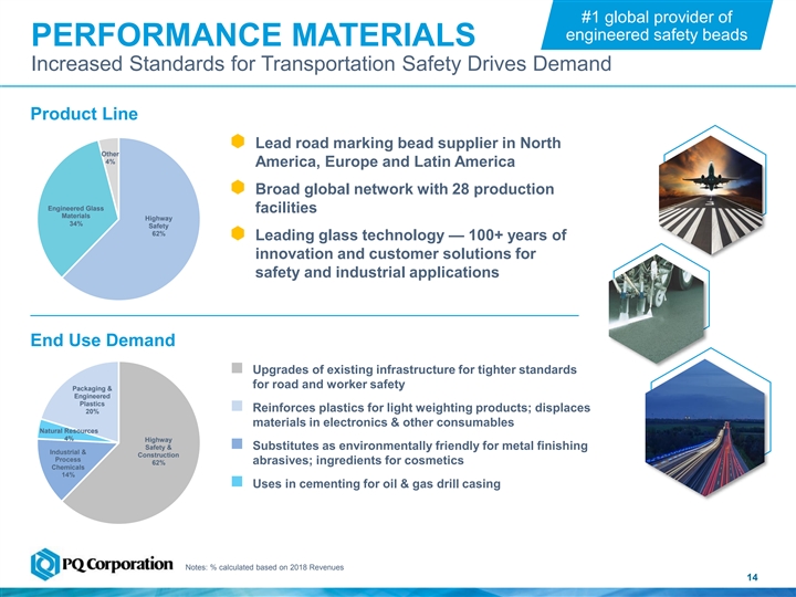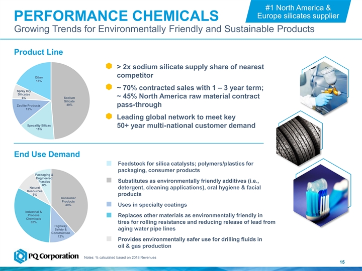 #1 global provider of engineered safety beads PERFORMANCE MATERIALS Increased Standards for Transportation Safety Drives Demand Product Line Lead road marking bead supplier in North Other 4% America, Europe and Latin America Broad global network with 28 production Engineered Glass facilities Materials Highway 34% Safety 62% Leading glass technology — 100+ years of innovation and customer solutions for safety and industrial applications End Use Demand Upgrades of existing infrastructure for tighter standards for road and worker safety Packaging & Engineered Plastics Reinforces plastics for light weighting products; displaces 20% materials in electronics & other consumables Natural Resources 4% Highway Safety & Substitutes as environmentally friendly for metal finishing Industrial & Construction Process abrasives; ingredients for cosmetics 62% Chemicals 14% Uses in cementing for oil & gas drill casing Notes: % calculated based on 2018 Revenues 14 14#1 global provider of engineered safety beads PERFORMANCE MATERIALS Increased Standards for Transportation Safety Drives Demand Product Line Lead road marking bead supplier in North Other 4% America, Europe and Latin America Broad global network with 28 production Engineered Glass facilities Materials Highway 34% Safety 62% Leading glass technology — 100+ years of innovation and customer solutions for safety and industrial applications End Use Demand Upgrades of existing infrastructure for tighter standards for road and worker safety Packaging & Engineered Plastics Reinforces plastics for light weighting products; displaces 20% materials in electronics & other consumables Natural Resources 4% Highway Safety & Substitutes as environmentally friendly for metal finishing Industrial & Construction Process abrasives; ingredients for cosmetics 62% Chemicals 14% Uses in cementing for oil & gas drill casing Notes: % calculated based on 2018 Revenues 14 14