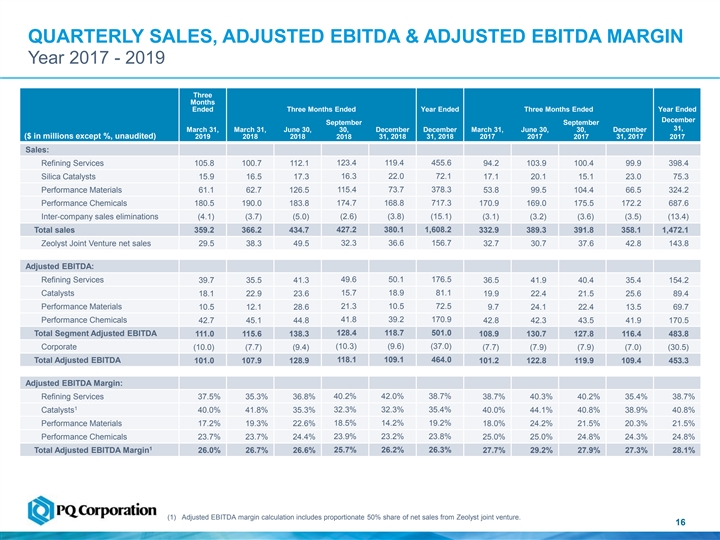 QUARTERLY SALES, ADJUSTED EBITDA & ADJUSTED EBITDA MARGIN Year 2017 - 2019 Three Months For the Quarter Ended Ended Three Months Ended Year Ended Three Months Ended Year Ended December September September 31, March 31, March 31, June 30, 30, December December March 31, June 30, 30, December ($ in millions except %, unaudited) 2019 2018 2018 2018 31, 2018 31, 2018 2017 2017 2017 31, 2017 2017 Sales: Refining Services 105.8 100.7 112.1 123.4 119.4 455.6 94.2 103.9 100.4 99.9 398.4 Silica Catalysts 15.9 16.5 17.3 16.3 22.0 72.1 17.1 20.1 15.1 23.0 75.3 115.4 73.7 378.3 Performance Materials 61.1 62.7 126.5 53.8 99.5 104.4 66.5 324.2 Performance Chemicals 180.5 190.0 183.8 174.7 168.8 717.3 170.9 169.0 175.5 172.2 687.6 Inter-company sales eliminations (4.1) (3.7) (5.0) (2.6) (3.8) (15.1) (3.1) (3.2) (3.6) (3.5) (13.4) 427.2 380.1 1,608.2 Total sales 359.2 366.2 434.7 332.9 389.3 391.8 358.1 1,472.1 Zeolyst Joint Venture net sales 29.5 38.3 49.5 32.3 36.6 156.7 32.7 30.7 37.6 42.8 143.8 Adjusted EBITDA: 49.6 50.1 176.5 Refining Services 39.7 35.5 41.3 36.5 41.9 40.4 35.4 154.2 Catalysts 18.1 22.9 23.6 15.7 18.9 81.1 19.9 22.4 21.5 25.6 89.4 Performance Materials 21.3 10.5 72.5 10.5 12.1 28.6 9.7 24.1 22.4 13.5 69.7 41.8 39.2 170.9 Performance Chemicals 42.7 45.1 44.8 42.8 42.3 43.5 41.9 170.5 Total Segment Adjusted EBITDA 128.4 118.7 501.0 111.0 115.6 138.3 108.9 130.7 127.8 116.4 483.8 (10.3) (9.6) (37.0) Corporate (10.0) (7.7) (9.4) (7.7) (7.9) (7.9) (7.0) (30.5) 118.1 109.1 464.0 Total Adjusted EBITDA 101.0 107.9 128.9 101.2 122.8 119.9 109.4 453.3 Adjusted EBITDA Margin: Refining Services 37.5% 35.3% 36.8% 40.2% 42.0% 38.7% 38.7% 40.3% 40.2% 35.4% 38.7% 1 32.3% 32.3% 35.4% Catalysts 40.0% 41.8% 35.3% 40.0% 44.1% 40.8% 38.9% 40.8% Performance Materials 17.2% 19.3% 22.6% 18.5% 14.2% 19.2% 18.0% 24.2% 21.5% 20.3% 21.5% 23.9% 23.2% 23.8% Performance Chemicals 23.7% 23.7% 24.4% 25.0% 25.0% 24.8% 24.3% 24.8% 1 Total Adjusted EBITDA Margin 26.0% 26.7% 26.6% 25.7% 26.2% 26.3% 27.7% 29.2% 27.9% 27.3% 28.1% (1) Adjusted EBITDA margin calculation includes proportionate 50% share of net sales from Zeolyst joint venture. 16QUARTERLY SALES, ADJUSTED EBITDA & ADJUSTED EBITDA MARGIN Year 2017 - 2019 Three Months For the Quarter Ended Ended Three Months Ended Year Ended Three Months Ended Year Ended December September September 31, March 31, March 31, June 30, 30, December December March 31, June 30, 30, December ($ in millions except %, unaudited) 2019 2018 2018 2018 31, 2018 31, 2018 2017 2017 2017 31, 2017 2017 Sales: Refining Services 105.8 100.7 112.1 123.4 119.4 455.6 94.2 103.9 100.4 99.9 398.4 Silica Catalysts 15.9 16.5 17.3 16.3 22.0 72.1 17.1 20.1 15.1 23.0 75.3 115.4 73.7 378.3 Performance Materials 61.1 62.7 126.5 53.8 99.5 104.4 66.5 324.2 Performance Chemicals 180.5 190.0 183.8 174.7 168.8 717.3 170.9 169.0 175.5 172.2 687.6 Inter-company sales eliminations (4.1) (3.7) (5.0) (2.6) (3.8) (15.1) (3.1) (3.2) (3.6) (3.5) (13.4) 427.2 380.1 1,608.2 Total sales 359.2 366.2 434.7 332.9 389.3 391.8 358.1 1,472.1 Zeolyst Joint Venture net sales 29.5 38.3 49.5 32.3 36.6 156.7 32.7 30.7 37.6 42.8 143.8 Adjusted EBITDA: 49.6 50.1 176.5 Refining Services 39.7 35.5 41.3 36.5 41.9 40.4 35.4 154.2 Catalysts 18.1 22.9 23.6 15.7 18.9 81.1 19.9 22.4 21.5 25.6 89.4 Performance Materials 21.3 10.5 72.5 10.5 12.1 28.6 9.7 24.1 22.4 13.5 69.7 41.8 39.2 170.9 Performance Chemicals 42.7 45.1 44.8 42.8 42.3 43.5 41.9 170.5 Total Segment Adjusted EBITDA 128.4 118.7 501.0 111.0 115.6 138.3 108.9 130.7 127.8 116.4 483.8 (10.3) (9.6) (37.0) Corporate (10.0) (7.7) (9.4) (7.7) (7.9) (7.9) (7.0) (30.5) 118.1 109.1 464.0 Total Adjusted EBITDA 101.0 107.9 128.9 101.2 122.8 119.9 109.4 453.3 Adjusted EBITDA Margin: Refining Services 37.5% 35.3% 36.8% 40.2% 42.0% 38.7% 38.7% 40.3% 40.2% 35.4% 38.7% 1 32.3% 32.3% 35.4% Catalysts 40.0% 41.8% 35.3% 40.0% 44.1% 40.8% 38.9% 40.8% Performance Materials 17.2% 19.3% 22.6% 18.5% 14.2% 19.2% 18.0% 24.2% 21.5% 20.3% 21.5% 23.9% 23.2% 23.8% Performance Chemicals 23.7% 23.7% 24.4% 25.0% 25.0% 24.8% 24.3% 24.8% 1 Total Adjusted EBITDA Margin 26.0% 26.7% 26.6% 25.7% 26.2% 26.3% 27.7% 29.2% 27.9% 27.3% 28.1% (1) Adjusted EBITDA margin calculation includes proportionate 50% share of net sales from Zeolyst joint venture. 16