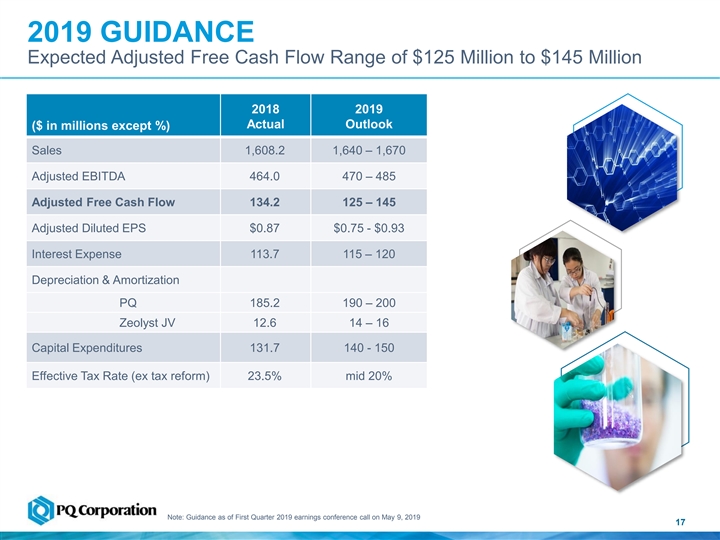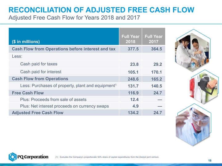 2019 GUIDANCE Expected Adjusted Free Cash Flow Range of $125 Million to $145 Million 2018 2019 Actual Outlook ($ in millions except %) Sales 1,608.2 1,640 – 1,670 Adjusted EBITDA 464.0 470 – 485 Adjusted Free Cash Flow 134.2 125 – 145 Adjusted Diluted EPS $0.87 $0.75 - $0.93 Interest Expense 113.7 115 – 120 Depreciation & Amortization PQ 185.2 190 – 200 Zeolyst JV 12.6 14 – 16 Capital Expenditures 131.7 140 - 150 Effective Tax Rate (ex tax reform) 23.5% mid 20% Note: Guidance as of First Quarter 2019 earnings conference call on May 9, 2019 172019 GUIDANCE Expected Adjusted Free Cash Flow Range of $125 Million to $145 Million 2018 2019 Actual Outlook ($ in millions except %) Sales 1,608.2 1,640 – 1,670 Adjusted EBITDA 464.0 470 – 485 Adjusted Free Cash Flow 134.2 125 – 145 Adjusted Diluted EPS $0.87 $0.75 - $0.93 Interest Expense 113.7 115 – 120 Depreciation & Amortization PQ 185.2 190 – 200 Zeolyst JV 12.6 14 – 16 Capital Expenditures 131.7 140 - 150 Effective Tax Rate (ex tax reform) 23.5% mid 20% Note: Guidance as of First Quarter 2019 earnings conference call on May 9, 2019 17
