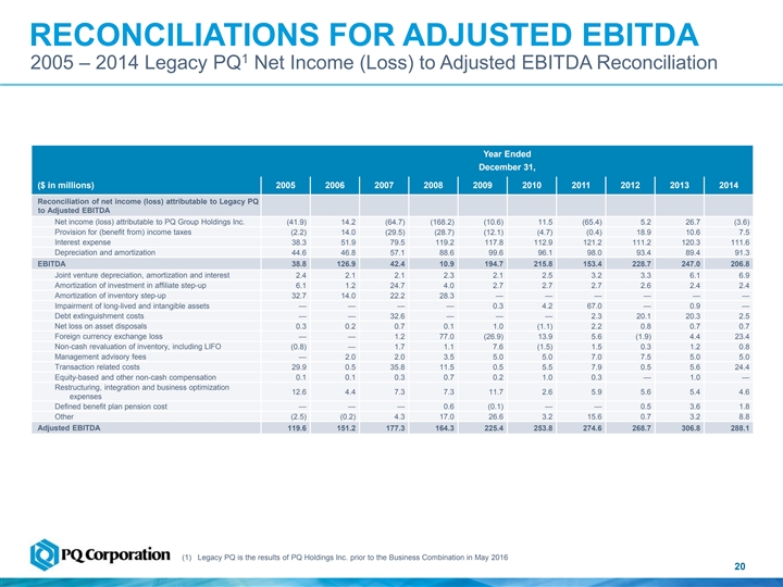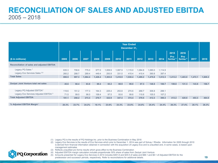 RECONCILIATION OF SALES AND ADJUSTED EBITDA 2005 – 2018 Year Ended December 31, 2015 2016 Pro Pro 3 3 forma forma ($ in millions) 2005 2006 2007 2008 2009 2010 2011 2012 2013 2014 2017 2018 Reconciliation of sales and adjusted EBITDA 1 Legacy PQ Sales 635.3 708.6 775.0 977.0 1,009.9 1,087.9 1,115.0 1,084.8 1,085.0 1,114.9 2,5 Legacy Eco Services Sales 260.2 288.7 289.4 449.4 293.9 331.0 415.4 410.4 390.8 397.4 Total Sales 895.5 997.3 1,064.4 1,426.4 1,303.8 1,418.9 1,530.4 1,495.2 1,475.8 1,512.3 1,413.2 1,403.0 1,472.1 1,608.2 Zeolyst Joint Venture total net sales 45.6 60.4 63.8 69.4 63.2 69.9 99.0 87.3 148.5 106.7 159.8 131.3 143.8 156.7 1 Legacy PQ Adjusted EBITDA 119.6 151.2 177.3 164.3 225.4 253.8 274.6 268.7 306.8 288.1 2 Legacy Eco Services Adjusted EBITDA 71.5 99.0 96.0 106.4 97.5 93.6 99.8 110.8 105.5 107.2 Total Adjusted EBITDA 191.1 250.2 273.3 270.7 322.9 347.4 374.4 379.5 412.3 395.3 413.2 420.8 453.3 464.0 4 % Adjusted EBITDA Margin 20.3% 23.7% 24.2% 18.1% 23.6% 23.3% 23.0% 24.0% 25.4% 24.4% 26.3% 27.4% 28.1% 26.3% (1) Legacy PQ is the results of PQ Holdings Inc. prior to the Business Combination in May 2016 (2) Legacy Eco Services is the results of Eco Services which prior to December 1, 2014 was part of Solvay / Rhodia. Information for 2005 through 2010 is derived from financial information obtained in connection with the acquisition of Legacy Eco and is unaudited and, in some cases, is based upon management estimates (3) Reflects unaudited pro forma results which gives effect to the Business Combination (4) Adjusted EBITDA margin calculation includes proportionate 50% share of sales from Zeolyst Joint Venture (5) Amounts presented for Legacy Eco Services in 2014 includes $361.8 and $35.5 of sales and $98.1 and $9.1 of Adjusted EBITDA for the predecessor and successor periods, respectively. Refer to reconciliations for additional details. 19RECONCILIATION OF SALES AND ADJUSTED EBITDA 2005 – 2018 Year Ended December 31, 2015 2016 Pro Pro 3 3 forma forma ($ in millions) 2005 2006 2007 2008 2009 2010 2011 2012 2013 2014 2017 2018 Reconciliation of sales and adjusted EBITDA 1 Legacy PQ Sales 635.3 708.6 775.0 977.0 1,009.9 1,087.9 1,115.0 1,084.8 1,085.0 1,114.9 2,5 Legacy Eco Services Sales 260.2 288.7 289.4 449.4 293.9 331.0 415.4 410.4 390.8 397.4 Total Sales 895.5 997.3 1,064.4 1,426.4 1,303.8 1,418.9 1,530.4 1,495.2 1,475.8 1,512.3 1,413.2 1,403.0 1,472.1 1,608.2 Zeolyst Joint Venture total net sales 45.6 60.4 63.8 69.4 63.2 69.9 99.0 87.3 148.5 106.7 159.8 131.3 143.8 156.7 1 Legacy PQ Adjusted EBITDA 119.6 151.2 177.3 164.3 225.4 253.8 274.6 268.7 306.8 288.1 2 Legacy Eco Services Adjusted EBITDA 71.5 99.0 96.0 106.4 97.5 93.6 99.8 110.8 105.5 107.2 Total Adjusted EBITDA 191.1 250.2 273.3 270.7 322.9 347.4 374.4 379.5 412.3 395.3 413.2 420.8 453.3 464.0 4 % Adjusted EBITDA Margin 20.3% 23.7% 24.2% 18.1% 23.6% 23.3% 23.0% 24.0% 25.4% 24.4% 26.3% 27.4% 28.1% 26.3% (1) Legacy PQ is the results of PQ Holdings Inc. prior to the Business Combination in May 2016 (2) Legacy Eco Services is the results of Eco Services which prior to December 1, 2014 was part of Solvay / Rhodia. Information for 2005 through 2010 is derived from financial information obtained in connection with the acquisition of Legacy Eco and is unaudited and, in some cases, is based upon management estimates (3) Reflects unaudited pro forma results which gives effect to the Business Combination (4) Adjusted EBITDA margin calculation includes proportionate 50% share of sales from Zeolyst Joint Venture (5) Amounts presented for Legacy Eco Services in 2014 includes $361.8 and $35.5 of sales and $98.1 and $9.1 of Adjusted EBITDA for the predecessor and successor periods, respectively. Refer to reconciliations for additional details. 19