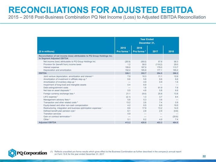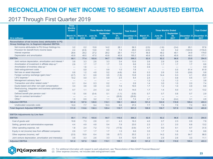 RECONCILIATIONS FOR ADJUSTED EBITDA 2015 – 2018 Post-Business Combination PQ Net Income (Loss) to Adjusted EBITDA Reconciliation Year Ended December 31, 2015 2016 1 1 ($ in millions) Pro forma Pro forma 2017 2018 Reconciliation of net income (loss) attributable to PQ Group Holdings Inc. to Segment Adjusted EBITDA Net income (loss) attributable to PQ Group Holdings Inc. (26.9) (59.0) 57.6 58.3 Provision for (benefit from) income taxes 1.2 58.0 (119.2) 29.0 Interest expense 199.6 187.9 179.0 113.7 Depreciation and amortization 152.2 165.8 177.1 185.2 EBITDA 326.1 352.7 294.5 386.2 a Joint venture depreciation, amortization and interest 7.9 10.3 11.1 12.6 b Amortization of investment in affiliate step-up 6.6 5.8 8.6 6.6 c Amortization of inventory step-up — 4.9 0.9 1.6 Impairment of long-lived and intangible assets 0.4 6.9 — — Debt extinguishment costs — 1.8 61.9 7.8 d Net loss on asset disposals 5.5 4.8 5.8 6.6 e Foreign currency exchange loss 21.1 (9.0) 25.8 13.8 f LIFO expense (2.1) 1.3 3.7 8.4 g Management advisory fees 5.6 5.3 3.8 — h Transaction and other related costs 13.2 2.6 7.4 0.9 Equity-based and other non-cash compensation 4.2 6.5 8.8 19.5 i Restructuring, integration and business optimization expenses 8.6 17.9 13.2 14.0 j Defined benefit plan pension cost 6.1 2.8 2.9 (0.8) Transition services 4.9 — — — k Gain on contract termination — — — (20.6) l Other 5.1 6.2 4.9 7.4 Adjusted EBITDA 413.2 420.8 453.3 464.0 (1) Reflects unaudited pro forma results which gives effect to the Business Combination as further described in the company’s annual report on Form 10-K for the year ended December 31, 2017 22RECONCILIATIONS FOR ADJUSTED EBITDA 2015 – 2018 Post-Business Combination PQ Net Income (Loss) to Adjusted EBITDA Reconciliation Year Ended December 31, 2015 2016 1 1 ($ in millions) Pro forma Pro forma 2017 2018 Reconciliation of net income (loss) attributable to PQ Group Holdings Inc. to Segment Adjusted EBITDA Net income (loss) attributable to PQ Group Holdings Inc. (26.9) (59.0) 57.6 58.3 Provision for (benefit from) income taxes 1.2 58.0 (119.2) 29.0 Interest expense 199.6 187.9 179.0 113.7 Depreciation and amortization 152.2 165.8 177.1 185.2 EBITDA 326.1 352.7 294.5 386.2 a Joint venture depreciation, amortization and interest 7.9 10.3 11.1 12.6 b Amortization of investment in affiliate step-up 6.6 5.8 8.6 6.6 c Amortization of inventory step-up — 4.9 0.9 1.6 Impairment of long-lived and intangible assets 0.4 6.9 — — Debt extinguishment costs — 1.8 61.9 7.8 d Net loss on asset disposals 5.5 4.8 5.8 6.6 e Foreign currency exchange loss 21.1 (9.0) 25.8 13.8 f LIFO expense (2.1) 1.3 3.7 8.4 g Management advisory fees 5.6 5.3 3.8 — h Transaction and other related costs 13.2 2.6 7.4 0.9 Equity-based and other non-cash compensation 4.2 6.5 8.8 19.5 i Restructuring, integration and business optimization expenses 8.6 17.9 13.2 14.0 j Defined benefit plan pension cost 6.1 2.8 2.9 (0.8) Transition services 4.9 — — — k Gain on contract termination — — — (20.6) l Other 5.1 6.2 4.9 7.4 Adjusted EBITDA 413.2 420.8 453.3 464.0 (1) Reflects unaudited pro forma results which gives effect to the Business Combination as further described in the company’s annual report on Form 10-K for the year ended December 31, 2017 22