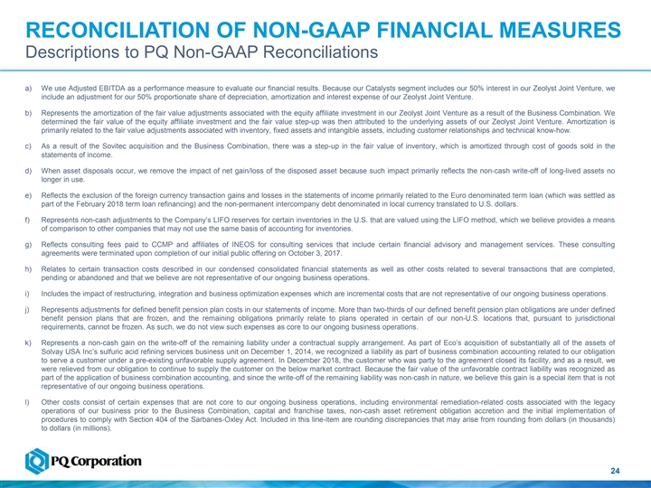 RECONCILATION OF NET INCOME TO SEGMENT ADJUSTED EBITDA 2017 Through First Quarter 2019 Three Months Ended Three Months Ended Three Months Ended Year Ended Year Ended September December September March 31, March 31, June 30, 30, 31, December 31, March 31, June 30, 30, December 31, December 31, ($ in millions) 2019 2018 2018 2018 2018 2018 2017 2017 2017 2017 2017 Reconciliation of net income (loss) attributable to PQ Group Holdings Inc. to Segment Adjusted EBITDA Net income attributable to PQ Group Holdings Inc. 3.2 0.2 15.8 14.2 28.1 58.3 (2.5) (1.6) (3.4) 65.1 57.6 Provision for (benefit from) income taxes 2.4 (0.5) 13.6 8.5 7.4 29.0 (2.9) 3.0 5.2 (124.5) (119.2) Interest expense 28.6 29.2 27.2 28.2 29.1 113.7 46.8 48.2 49.1 34.9 179.0 Depreciation and amortization 45.9 48.5 47.0 43.8 45.9 185.2 40.6 42.6 45.9 48.0 177.1 EBITDA 80.1 77.4 103.6 94.7 110.5 386.2 82.0 92.2 96.8 23.5 294.5 a Joint venture depreciation, amortization and interest 3.8 3.3 2.6 3.3 3.4 12.6 2.6 2.9 2.6 3.0 11.1 b Amortization of investment in affiliate step-up 2.6 1.7 1.7 1.7 1.5 6.6 3.5 1.7 1.7 1.7 8.6 c Amortization of inventory step-up — 1.6 — — — 1.6 0.9 — — — 0.9 Debt extinguishment costs — 5.9 — 0.9 1.0 7.8 — — 0.5 61.4 61.9 d Net loss on asset disposals 0.8 1.2 4.8 5.2 (4.6) 6.6 0.3 2.6 3.5 (0.6) 5.8 e Foreign currency exchange (gain) loss 3.5 (1.6) 13.8 4.1 25.8 (2.7) 5.1 6.8 2.0 14.4 5.3 f LIFO expense 10.2 4.9 0.1 0.9 2.5 8.4 2.4 — 0.8 0.5 3.7 g Management advisory fees — — — — — — 1.3 1.3 1.3 — 3.8 h Transaction and other related costs 0.1 0.4 0.3 0.2 — 0.9 1.4 3.0 1.0 2.0 7.4 Equity-based and other non-cash compensation 4.3 7.6 19.5 4.9 8.8 3.4 3.8 3.8 1.7 1.2 1.0 Restructuring, integration and business optimization 2.2 8.3 14.0 5.1 13.2 0.7 1.1 2.4 1.7 1.4 5.0 I expenses j Defined benefit plan pension cost 0.1 (1.1) (0.8) 0.7 2.9 1.0 0.6 (0.4) 0.7 0.7 0.8 k Gain on contract termination — — — — (20.6) (20.6) — — — — — l Other 1.0 0.9 3.2 1.1 2.2 7.4 0.7 1.4 (0.4) 3.1 4.9 Adjusted EBITDA 101.0 107.9 128.9 118.1 109.1 464.0 101.2 122.8 119.9 109.4 453.3 Unallocated corporate costs 10.3 9.6 37.0 7.7 7.9 7.9 7.0 30.5 10.0 7.7 9.4 1 Total Segment Adjusted EBITDA 111.0 115.6 138.3 128.4 118.7 501.0 108.9 130.7 127.8 116.4 483.8 EBITDA Adjustments by Line Item EBITDA 80.1 77.4 103.6 94.7 110.5 386.2 82.0 92.2 96.8 23.5 294.5 Cost of goods sold 10.8 7.3 2.6 2.1 4.3 16.3 4.0 0.7 2.3 0.9 7.9 Selling, general and administrative expenses 4.4 4.9 4.8 5.4 7.9 23.0 2.3 2.1 2.0 6.8 13.2 7.3 (17.8) (0.9) Other operating expense, net 1.8 2.4 7.2 4.7 9.0 9.1 8.7 31.5 Equity in net (income) loss from affiliated companies 2.6 1.7 1.7 1.7 1.5 6.6 3.5 1.7 1.6 1.8 8.6 2 Other expense (income), net (2.5) 10.9 6.4 3.6 (0.7) 20.2 2.1 14.2 5.5 64.7 86.5 Joint venture depreciation, amortization and interest(a) 3.8 3.3 2.6 3.3 3.4 12.6 2.6 2.9 2.6 3.0 11.1 Adjusted EBITDA 101.0 107.9 128.9 118.1 109.1 464.0 101.2 122.8 119.9 109.4 453.3 (1) For additional information with respect to each adjustment, see “Reconciliation of Non-GAAP Financial Measures” (2) Other expense (income), net includes debt extinguishment costs 23RECONCILATION OF NET INCOME TO SEGMENT ADJUSTED EBITDA 2017 Through First Quarter 2019 Three Months Ended Three Months Ended Three Months Ended Year Ended Year Ended September December September March 31, March 31, June 30, 30, 31, December 31, March 31, June 30, 30, December 31, December 31, ($ in millions) 2019 2018 2018 2018 2018 2018 2017 2017 2017 2017 2017 Reconciliation of net income (loss) attributable to PQ Group Holdings Inc. to Segment Adjusted EBITDA Net income attributable to PQ Group Holdings Inc. 3.2 0.2 15.8 14.2 28.1 58.3 (2.5) (1.6) (3.4) 65.1 57.6 Provision for (benefit from) income taxes 2.4 (0.5) 13.6 8.5 7.4 29.0 (2.9) 3.0 5.2 (124.5) (119.2) Interest expense 28.6 29.2 27.2 28.2 29.1 113.7 46.8 48.2 49.1 34.9 179.0 Depreciation and amortization 45.9 48.5 47.0 43.8 45.9 185.2 40.6 42.6 45.9 48.0 177.1 EBITDA 80.1 77.4 103.6 94.7 110.5 386.2 82.0 92.2 96.8 23.5 294.5 a Joint venture depreciation, amortization and interest 3.8 3.3 2.6 3.3 3.4 12.6 2.6 2.9 2.6 3.0 11.1 b Amortization of investment in affiliate step-up 2.6 1.7 1.7 1.7 1.5 6.6 3.5 1.7 1.7 1.7 8.6 c Amortization of inventory step-up — 1.6 — — — 1.6 0.9 — — — 0.9 Debt extinguishment costs — 5.9 — 0.9 1.0 7.8 — — 0.5 61.4 61.9 d Net loss on asset disposals 0.8 1.2 4.8 5.2 (4.6) 6.6 0.3 2.6 3.5 (0.6) 5.8 e Foreign currency exchange (gain) loss 3.5 (1.6) 13.8 4.1 25.8 (2.7) 5.1 6.8 2.0 14.4 5.3 f LIFO expense 10.2 4.9 0.1 0.9 2.5 8.4 2.4 — 0.8 0.5 3.7 g Management advisory fees — — — — — — 1.3 1.3 1.3 — 3.8 h Transaction and other related costs 0.1 0.4 0.3 0.2 — 0.9 1.4 3.0 1.0 2.0 7.4 Equity-based and other non-cash compensation 4.3 7.6 19.5 4.9 8.8 3.4 3.8 3.8 1.7 1.2 1.0 Restructuring, integration and business optimization 2.2 8.3 14.0 5.1 13.2 0.7 1.1 2.4 1.7 1.4 5.0 I expenses j Defined benefit plan pension cost 0.1 (1.1) (0.8) 0.7 2.9 1.0 0.6 (0.4) 0.7 0.7 0.8 k Gain on contract termination — — — — (20.6) (20.6) — — — — — l Other 1.0 0.9 3.2 1.1 2.2 7.4 0.7 1.4 (0.4) 3.1 4.9 Adjusted EBITDA 101.0 107.9 128.9 118.1 109.1 464.0 101.2 122.8 119.9 109.4 453.3 Unallocated corporate costs 10.3 9.6 37.0 7.7 7.9 7.9 7.0 30.5 10.0 7.7 9.4 1 Total Segment Adjusted EBITDA 111.0 115.6 138.3 128.4 118.7 501.0 108.9 130.7 127.8 116.4 483.8 EBITDA Adjustments by Line Item EBITDA 80.1 77.4 103.6 94.7 110.5 386.2 82.0 92.2 96.8 23.5 294.5 Cost of goods sold 10.8 7.3 2.6 2.1 4.3 16.3 4.0 0.7 2.3 0.9 7.9 Selling, general and administrative expenses 4.4 4.9 4.8 5.4 7.9 23.0 2.3 2.1 2.0 6.8 13.2 7.3 (17.8) (0.9) Other operating expense, net 1.8 2.4 7.2 4.7 9.0 9.1 8.7 31.5 Equity in net (income) loss from affiliated companies 2.6 1.7 1.7 1.7 1.5 6.6 3.5 1.7 1.6 1.8 8.6 2 Other expense (income), net (2.5) 10.9 6.4 3.6 (0.7) 20.2 2.1 14.
