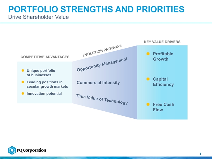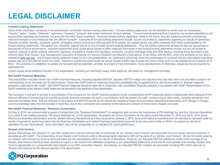 LEGAL DISCLAIMER Forward-Looking Statements Some of the information contained in this presentation constitutes “forward-looking statements”. Forward-looking statements can be identified by words such as “anticipates,” “intends,” “plans,” “seeks,” “believes,” “estimates,” “expects,” “projects” and similar references to future periods. Forward-looking statements are based on our current expectations and assumptions regarding our business, the economy and other future conditions. Because forward-looking statements relate to the future, they are subject to inherent uncertainties, risks and changes in circumstances that are difficult to predict. Examples of forward looking statements include, but are not limited to, statements regarding our results of operations, financial condition, liquidity, prospects, growth, strategies, product and service offerings and 2019 outlook. Our actual results may differ materially from those contemplated by the forward-looking statements. We caution you, therefore, against relying on any of these forward-looking statements. They are neither statements of historical fact nor guarantees or assurances of future performance. Important factors that could cause actual results to differ materially from those in the forward-looking statements include, but are not limited to, regional, national or global political, economic, business, competitive, market and regulatory conditions, currency exchange rates and other factors, including those described in the sections titled “Risk Factors” and “Management Discussion & Analysis of Financial Condition and Results of Operations” in our filings with the SEC, which are available on the SEC’s website at www.sec.gov. Any forward-looking statement made by us in this presentation, the conference call during which this presentation is reviewed and any discussions that follow speaks only as of the date on which it is made. Factors or events that could cause our actual results to differ may emerge from time to time, and it is not possible for us to predict all of them. We undertake no obligation to update any forward-looking statement, whether as a result of new information, future developments or otherwise, except as may be required by applicable law. Certain supply share statistics included in this presentation, including our estimated supply share positions, are based on management estimates. Non-GAAP Financial Measures This presentation includes certain non-GAAP financial measures, including adjusted EBITDA, adjusted EBITDA margin and adjusted free cash flow which are provided to assist in an understanding of our business and its performance. These non-GAAP financial measures should be considered only as supplemental to, and not as superior to, financial measures prepared in accordance with GAAP. Non-GAAP financial measures should be read only in conjunction with consolidated financials prepared in accordance with GAAP. Reconciliations of non- GAAP measures to the relevant GAAP measures are provided in the appendix of this presentation. The Company is not able to provide a reconciliation of the Company’s non-GAAP financial guidance to the corresponding GAAP measures without unreasonable effort because of the inherent difficulty in forecasting and quantifying certain amounts necessary for such a reconciliation such as certain non-cash, nonrecurring or other items, including transaction and restructuring related items, that are included in net income and EBITDA as well as the related tax impacts of these items and asset dispositions/acquisitions and changes in foreign currency exchange rates that are included in cash flow, due to the uncertainty and variability of the nature and amount of these future charges and costs. Non-GAAP Financial Measures – Business Combination On May 4, 2016, we consummated a series of transactions (the Business Combination ) to reorganize and combine the businesses of PQ Holdings Inc. and Eco Services Operations LLC under a new holding company, PQ Group Holdings Inc. In this presentation, we present pro forma information for the years ended December 31, 2016 and 2015, which gives effect to the Business Combination and the related financing transactions as if they occurred on January 1, 2015. Such information is illustrative and not intended to represent what our results of operations would have been had the Business Combination and related financing transactions occurred at any time prior to May 4, 2016 or to project our results of operations for any future period. Such information may not be comparable to, or indicative of, future performance. Zeolyst Joint Venture Zeolyst International and Zeolyst C.V. (our 50% owned joint ventures that we refer to collectively as our “Zeolyst Joint Venture”) are accounted for as an equity method investment in accordance with GAAP. The presentation of our Zeolyst Joint Venture’s sales in this presentation represents 50% of the sales of our Zeolyst Joint Venture. We do not record sales by our Zeolyst Joint Venture as revenue and such sales are not consolidated within our results of operations. However, our Adjusted EBITDA reflects our share of the earnings of our Zeolyst Joint Venture that have been recorded as equity in net income from affiliated companies in our consolidated statements of income for such periods and includes Zeolyst Joint Venture adjustments on a proportionate basis based on our 50% ownership interest. Accordingly, our Adjusted EBITDA margins are calculated including 50% of the sales of our Zeolyst Joint Venture for the relevant periods in the denominator. 2LEGAL DISCLAIMER Forward-Looking Statements Some of the information contained in this presentation constitutes “forward-looking statements”. Forward-looking statements can be identified by words such as “anticipates,” “intends,” “plans,” “seeks,” “believes,” “estimates,” “expects,” “projects” and similar refer