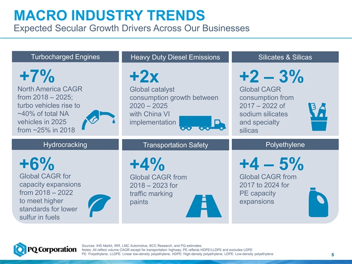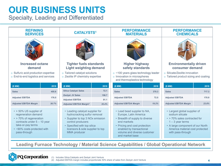 OUR BUSINESS UNITS Specialty, Leading and Differentiated REFINING PERFORMANCE PERFORMANCE 1 CATALYSTS SERVICES MATERIALS CHEMICALS Increased octane Tighter fuels standards Higher highway Environmentally driven demand Light weighting demand safety standards consumer demand o Sulfuric acid production expertise o Tailored catalyst solutions o ~100 years glass technology leader o Silicate/Zeolite innovation o End-to-end logistics and services o Zeolite IP chemistry expertise o Innovation in microspheres o Tailored product sizing and coating and thermoplastics technology ($ MM) 2018 ($ MM) 2018 ($ MM) 2018 ($ MM) 2018 Silica Catalyst Sales 72.1 Sales 455.6 Sales 378.3 Sales 717.3 Zeolyst JV Sales 156.7 Adjusted EBITDA 176.5 Adjusted EBITDA 72.5 Adjusted EBITDA 170.9 Adjusted EBITDA 81.1 Adjusted EBITDA Margin 38.7% 2 Adjusted EBITDA Margin 19.2% Adjusted EBITDA Margin 23.8% Adjusted EBITDA Margin 35.4% • > 50% US supplier of • Leading catalyst supplier for • Lead bead supplier to NA, • Largest global supplier of regeneration demand hydrocracking sulfur removal Europe, Latin America sodium silicate • > 70% of regeneration • Supplier to top 3 NOx emission • Breadth of supply to diverse • > 70% sales contracted for contracts under 5 – 10 year control producers end markets 1 – 3 year terms take-or-pay terms • Specified with top silica • Pricing and cost protection • A large component of our North • ~90% costs protected with licensors & sole supplier to top enabled by transactional America material cost protected pass-through MMA producer volume and diverse customer with pass-through and market base Leading Furnace Technology / Material Science Capabilities / Global Operational Network (1) Includes Silica Catalysts and Zeolyst Joint Venture (2) Adjusted EBITDA margin includes proportionate 50% share of sales from Zeolyst Joint Venture 4OUR BUSINESS UNITS Specialty, Leading and Differentiated REFINING PERFORMANCE PERFORMANCE 1 CATALYSTS SERVICES MATERIALS CHEMICALS Increased octane Tighter fuels standards Higher highway Environmentally driven demand Light weighting demand safety standards consumer demand o Sulfuric acid production expertise o Tailored catalyst solutions o ~100 years glass technology leader o Silicate/Zeolite innovation o End-to-end logistics and services o Zeolite IP chemistry expertise o Innovation in microspheres o Tailored product sizing and coating and thermoplastics technology ($ MM) 2018 ($ MM) 2018 ($ MM) 2018 ($ MM) 2018 Silica Catalyst Sales 72.1 Sales 455.6 Sales 378.3 Sales 717.3 Zeolyst JV Sales 156.7 Adjusted EBITDA 176.5 Adjusted EBITDA 72.5 Adjusted EBITDA 170.9 Adjusted EBITDA 81.1 Adjusted EBITDA Margin 38.7% 2 Adjusted EBITDA Margin 19.2% Adjusted EBITDA Margin 23.8% Adjusted EBITDA Margin 35.4% • > 50% US supplier of • Leading catalyst supplier for • Lead bead supplier to NA, • Largest global supplier of regeneration demand hydrocracking sulfur removal Europe, Latin America sodium silicate • > 70% of regeneration • Supplier to top 3 NOx emission • Breadth of supply to diverse • > 70% sales contracted for contracts under 5 – 10 year control producers end markets 1 – 3 year terms take-or-pay terms • Specified with top silica • Pricing and cost protection • A large component of our North • ~90% costs protected with licensors & sole supplier to top enabled by transactional America material cost protected pass-through MMA producer volume and diverse customer with pass-through and market base Leading Furnace Technology / Material Science Capabilities / Global Operational Network (1) Includes Silica Catalysts and Zeolyst Joint Venture (2) Adjusted EBITDA margin includes proportionate 50% share of sales from Zeolyst Joint Venture 4