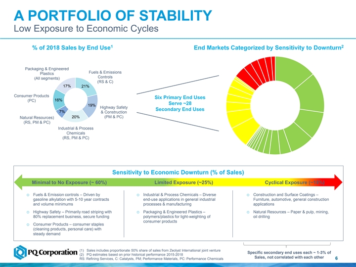 MACRO INDUSTRY TRENDS Expected Secular Growth Drivers Across Our Businesses Turbocharged Engines Heavy Duty Diesel Emissions Silicates & Silicas +7% +2x +2 – 3% North America CAGR Global catalyst Global CAGR from 2018 – 2025; consumption growth between consumption from turbo vehicles rise to 2020 – 2025 2017 – 2022 of ~40% of total NA with China VI sodium silicates vehicles in 2025 implementation and specialty from ~25% in 2018 silicas Hydrocracking Transportation Safety Polyethylene +6% +4% +4 – 5% Global CAGR for Global CAGR from Global CAGR from capacity expansions 2017 to 2024 for 2018 – 2023 for from 2018 – 2022 PE capacity traffic marking to meet higher expansions paints standards for lower sulfur in fuels Sources: IHS Markit, IRR, LMC Automotive, BCC Research, and PQ estimates; Notes: All reflect volume CAGR except for transportation highway; PE reflects HDPE/LLDPE and excludes LDPE PE: Polyethylene; LLDPE: Linear low-density polyethylene; HDPE: High-density polyethylene; LDPE: Low-density polyethylene 5MACRO INDUSTRY TRENDS Expected Secular Growth Drivers Across Our Businesses Turbocharged Engines Heavy Duty Diesel Emissions Silicates & Silicas +7% +2x +2 – 3% North America CAGR Global catalyst Global CAGR from 2018 – 2025; consumption growth between consumption from turbo vehicles rise to 2020 – 2025 2017 – 2022 of ~40% of total NA with China VI sodium silicates vehicles in 2025 implementation and specialty from ~25% in 2018 silicas Hydrocracking Transportation Safety Polyethylene +6% +4% +4 – 5% Global CAGR for Global CAGR from Global CAGR from capacity expansions 2017 to 2024 for 2018 – 2023 for from 2018 – 2022 PE capacity traffic marking to meet higher expansions paints standards for lower sulfur in fuels Sources: IHS Markit, IRR, LMC Automotive, BCC Research, and PQ estimates; Notes: All reflect volume CAGR except for transportation highway; PE reflects HDPE/LLDPE and excludes LDPE PE: Polyethylene; LLDPE: Linear low-density polyethylene; HDPE: High-density polyethylene; LDPE: Low-density polyethylene 5