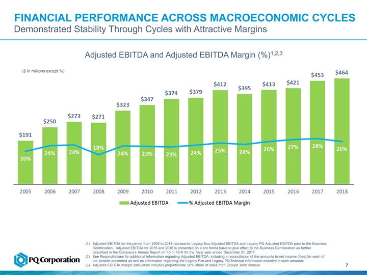 A PORTFOLIO OF STABILITY Low Exposure to Economic Cycles 1 2 % of 2018 Sales by End Use End Markets Categorized by Sensitivity to Downturn Packaging & Engineered Fuels & Emissions Plastics Controls (All segments) (RS & C) 17% 21% Consumer Products Six Primary End Uses 16% (PC) Serve ~28 19% Highway Safety Secondary End Uses 7% & Construction 20% (PM & PC) Natural Resources) (RS, PM & PC) Industrial & Process Chemicals (RS, PM & PC) Sensitivity to Economic Downturn (% of Sales) Minimal to No Exposure (~ 60%) Limited Exposure (~25%) Cyclical Exposure (~15%) o Fuels & Emission controls – Driven by o Industrial & Process Chemicals – Diverse o Construction and Surface Coatings – gasoline alkylation with 5-10 year contracts end-use applications in general industrial Furniture, automotive, general construction and volume minimums processes & manufacturing applications o Highway Safety – Primarily road striping with o Packaging & Engineered Plastics – o Natural Resources – Paper & pulp, mining, 80% replacement business, secure funding polymers/plastics for light-weighting of oil drilling consumer products o Consumer Products – consumer staples (cleaning products, personal care) with steady demand (1) Sales includes proportionate 50% share of sales from Zeolyst International joint venture Specific secondary end uses each ~ 1-3% of (2) PQ estimates based on prior historical performance 2015-2018 Sales, not correlated with each other 6 RS: Refining Services, C: Catalysts, PM; Performance Materials, PC: Performance ChemicalsA PORTFOLIO OF STABILITY Low Exposure to Economic Cycles 1 2 % of 2018 Sales by End Use End Markets Categorized by Sensitivity to Downturn Packaging & Engineered Fuels & Emissions Plastics Controls (All segments) (RS & C) 17% 21% Consumer Products Six Primary End Uses 16% (PC) Serve ~28 19% Highway Safety Secondary End Uses 7% & Construction 20% (PM & PC) Natural Resources) (RS, PM & PC) Industrial & Process Chemicals (RS, PM & PC) Sensitivity to Economic Downturn (% of Sales) Minimal to No Exposure (~ 60%) Limited Exposure (~25%) Cyclical Exposure (~15%) o Fuels & Emission controls – Driven by o Industrial & Process Chemicals – Diverse o Construction and Surface Coatings – gasoline alkylation with 5-10 year contracts end-use applications in general industrial Furniture, automotive, general construction and volume minimums processes & manufacturing applications o Highway Safety – Primarily road striping with o Packaging & Engineered Plastics – o Natural Resources – Paper & pulp, mining, 80% replacement business, secure funding polymers/plastics for light-weighting of oil drilling consumer products o Consumer Products – consumer staples (cleaning products, personal care) with steady demand (1) Sales includes proportionate 50% share of sales from Zeolyst International joint venture Specific secondary end uses each ~ 1-3% of (2) PQ estimates based on prior historical performance 2015-2018 Sales, not correlated with each other 6 RS: Refining Services, C: Catalysts, PM; Performance Materials, PC: Performance Chemicals