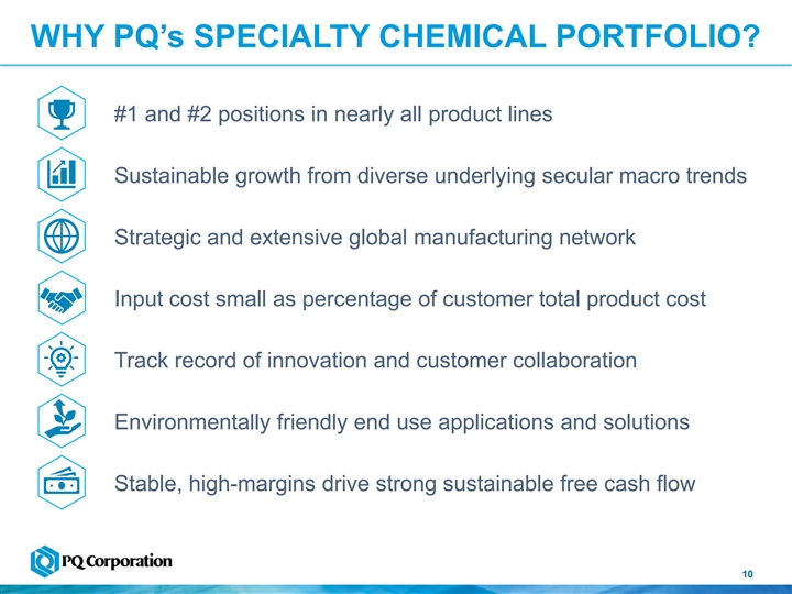 WHY PQ’s SPECIALTY CHEMICAL PORTFOLIO? #1 and #2 positions in nearly all product lines Sustainable growth from diverse underlying secular macro trends Strategic and extensive global manufacturing network Input cost small as percentage of customer total product cost Track record of innovation and customer collaboration Environmentally friendly end use applications and solutions Stable, high-margins drive strong sustainable free cash flow 10WHY PQ’s SPECIALTY CHEMICAL PORTFOLIO? #1 and #2 positions in nearly all product lines Sustainable growth from diverse underlying secular macro trends Strategic and extensive global manufacturing network Input cost small as percentage of customer total product cost Track record of innovation and customer collaboration Environmentally friendly end use applications and solutions Stable, high-margins drive strong sustainable free cash flow 10