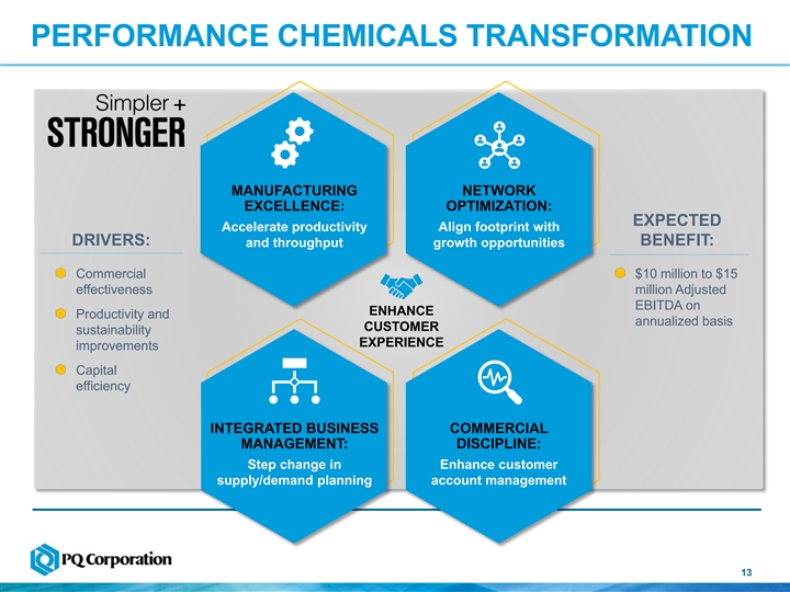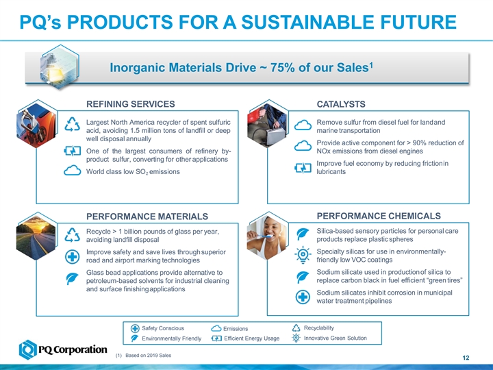 PQ’s PRODUCTS FOR A SUSTAINABLE FUTURE 1 Inorganic Materials Drive ~ 75% of our Sales REFINING SERVICES CATALYSTS Largest North America recycler of spent sulfuric Remove sulfur from diesel fuel for landand acid, avoiding 1.5 million tons of landfill or deep marine transportation well disposal annually Provide active component for > 90% reduction of One of the largest consumers of refinery by- NOx emissions from diesel engines product sulfur, converting for other applications Improve fuel economy by reducing frictionin World class low SO₂ emissions lubricants PERFORMANCE CHEMICALS PERFORMANCE MATERIALS Recycle > 1 billion pounds of glass per year, Silica-based sensory particles for personal care avoiding landfill disposal products replace plastic spheres Improve safety and save lives throughsuperior Specialty silicas for use in environmentally- road and airport marking technologies friendly low VOC coatings Glass bead applications provide alternative to Sodium silicate used in productionof silica to petroleum-based solvents for industrial cleaning replace carbon black in fuel efficient “green tires” and surface finishingapplications Sodium silicates inhibit corrosion in municipal water treatment pipelines Recyclability Safety Conscious Emissions Innovative Green Solution Environmentally Friendly Efficient Energy Usage (1) Based on 2019 Sales 12PQ’s PRODUCTS FOR A SUSTAINABLE FUTURE 1 Inorganic Materials Drive ~ 75% of our Sales REFINING SERVICES CATALYSTS Largest North America recycler of spent sulfuric Remove sulfur from diesel fuel for landand acid, avoiding 1.5 million tons of landfill or deep marine transportation well disposal annually Provide active component for > 90% reduction of One of the largest consumers of refinery by- NOx emissions from diesel engines product sulfur, converting for other applications Improve fuel economy by reducing frictionin World class low SO₂ emissions lubricants PERFORMANCE CHEMICALS PERFORMANCE MATERIALS Recycle > 1 billion pounds of glass per year, Silica-based sensory particles for personal care avoiding landfill disposal products replace plastic spheres Improve safety and save lives throughsuperior Specialty silicas for use in environmentally- road and airport marking technologies friendly low VOC coatings Glass bead applications provide alternative to Sodium silicate used in productionof silica to petroleum-based solvents for industrial cleaning replace carbon black in fuel efficient “green tires” and surface finishingapplications Sodium silicates inhibit corrosion in municipal water treatment pipelines Recyclability Safety Conscious Emissions Innovative Green Solution Environmentally Friendly Efficient Energy Usage (1) Based on 2019 Sales 12