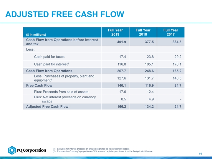 ADJUSTED FREE CASH FLOW Full Year Full Year Full Year ($ in millions) 2019 2018 2017 Cash Flow from Operations before interest 401.9 377.5 364.5 and tax Less: Cash paid for taxes 17.4 23.8 29.2 1 Cash paid for interest 116.8 105.1 170.1 Cash Flow from Operations 267.7 248.6 165.2 Less: Purchases of property, plant and 127.6 131.7 140.5 2 equipment Free Cash Flow 140.1 116.9 24.7 Plus: Proceeds from sale of assets 17.6 12.4 - Plus: Net interest proceeds on currency 8.5 4.9 - swaps Adjusted Free Cash Flow 166.2 134.2 24.7 (1) Excludes net interest proceeds on swaps designated as net investment hedges (2) Excludes the Company’s proportionate 50% share of capital expenditures from the Zeolyst Joint Venture 14ADJUSTED FREE CASH FLOW Full Year Full Year Full Year ($ in millions) 2019 2018 2017 Cash Flow from Operations before interest 401.9 377.5 364.5 and tax Less: Cash paid for taxes 17.4 23.8 29.2 1 Cash paid for interest 116.8 105.1 170.1 Cash Flow from Operations 267.7 248.6 165.2 Less: Purchases of property, plant and 127.6 131.7 140.5 2 equipment Free Cash Flow 140.1 116.9 24.7 Plus: Proceeds from sale of assets 17.6 12.4 - Plus: Net interest proceeds on currency 8.5 4.9 - swaps Adjusted Free Cash Flow 166.2 134.2 24.7 (1) Excludes net interest proceeds on swaps designated as net investment hedges (2) Excludes the Company’s proportionate 50% share of capital expenditures from the Zeolyst Joint Venture 14