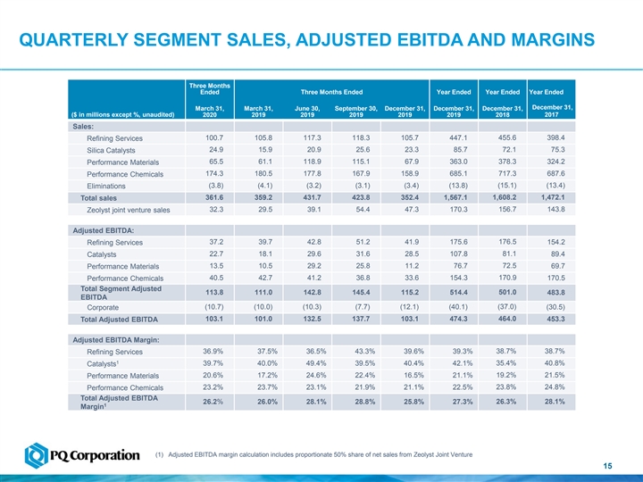 QUARTERLY SEGMENT SALES, ADJUSTED EBITDA AND MARGINS Three Months For the Quarter Ended Ended Three Months Ended Year Ended Year Ended Year Ended December 31, March 31, March 31, June 30, September 30, December 31, December 31, December 31, ($ in millions except %, unaudited) 2020 2019 2019 2019 2019 2019 2018 2017 Sales: 100.7 105.8 117.3 118.3 105.7 447.1 455.6 398.4 Refining Services 24.9 15.9 20.9 25.6 23.3 85.7 72.1 75.3 Silica Catalysts 65.5 61.1 118.9 115.1 67.9 363.0 378.3 324.2 Performance Materials 174.3 180.5 177.8 167.9 158.9 685.1 717.3 687.6 Performance Chemicals (15.1) (13.4) Eliminations (3.8) (4.1) (3.2) (3.1) (3.4) (13.8) 361.6 359.2 431.7 423.8 352.4 1,567.1 1,608.2 1,472.1 Total sales 32.3 29.5 39.1 54.4 47.3 170.3 156.7 143.8 Zeolyst joint venture sales Adjusted EBITDA: 37.2 39.7 42.8 51.2 41.9 175.6 176.5 154.2 Refining Services 22.7 18.1 29.6 31.6 28.5 107.8 81.1 89.4 Catalysts 72.5 Performance Materials 13.5 10.5 29.2 25.8 11.2 76.7 69.7 40.5 42.7 41.2 36.8 33.6 154.3 170.9 170.5 Performance Chemicals Total Segment Adjusted 113.8 111.0 142.8 145.4 115.2 514.4 501.0 483.8 EBITDA (37.0) Corporate (10.7) (10.0) (10.3) (7.7) (12.1) (40.1) (30.5) 103.1 101.0 132.5 137.7 103.1 474.3 464.0 453.3 Total Adjusted EBITDA Adjusted EBITDA Margin: 36.9% 37.5% 36.5% 43.3% 39.6% 39.3% 38.7% 38.7% Refining Services 1 Catalysts 39.7% 40.0% 49.4% 39.5% 40.4% 42.1% 35.4% 40.8% 20.6% 17.2% 24.6% 22.4% 16.5% 21.1% 19.2% 21.5% Performance Materials 23.2% 23.7% 23.1% 21.9% 21.1% 22.5% 23.8% 24.8% Performance Chemicals Total Adjusted EBITDA 26.2% 26.0% 28.1% 28.8% 25.8% 27.3% 26.3% 28.1% 1 Margin (1) Adjusted EBITDA margin calculation includes proportionate 50% share of net sales from Zeolyst Joint Venture 15QUARTERLY SEGMENT SALES, ADJUSTED EBITDA AND MARGINS Three Months For the Quarter Ended Ended Three Months Ended Year Ended Year Ended Year Ended December 31, March 31, March 31, June 30, September 30, December 31, December 31, December 31, ($ in millions except %, unaudited) 2020 2019 2019 2019 2019 2019 2018 2017 Sales: 100.7 105.8 117.3 118.3 105.7 447.1 455.6 398.4 Refining Services 24.9 15.9 20.9 25.6 23.3 85.7 72.1 75.3 Silica Catalysts 65.5 61.1 118.9 115.1 67.9 363.0 378.3 324.2 Performance Materials 174.3 180.5 177.8 167.9 158.9 685.1 717.3 687.6 Performance Chemicals (15.1) (13.4) Eliminations (3.8) (4.1) (3.2) (3.1) (3.4) (13.8) 361.6 359.2 431.7 423.8 352.4 1,567.1 1,608.2 1,472.1 Total sales 32.3 29.5 39.1 54.4 47.3 170.3 156.7 143.8 Zeolyst joint venture sales Adjusted EBITDA: 37.2 39.7 42.8 51.2 41.9 175.6 176.5 154.2 Refining Services 22.7 18.1 29.6 31.6 28.5 107.8 81.1 89.4 Catalysts 72.5 Performance Materials 13.5 10.5 29.2 25.8 11.2 76.7 69.7 40.5 42.7 41.2 36.8 33.6 154.3 170.9 170.5 Performance Chemicals Total Segment Adjusted 113.8 111.0 142.8 145.4 115.2 514.4 501.0 483.8 EBITDA (37.0) Corporate (10.7) (10.0) (10.3) (7.7) (12.1) (40.1) (30.5) 103.1 101.0 132.5 137.7 103.1 474.3 464.0 453.3 Total Adjusted EBITDA Adjusted EBITDA Margin: 36.9% 37.5% 36.5% 43.3% 39.6% 39.3% 38.7% 38.7% Refining Services 1 Catalysts 39.7% 40.0% 49.4% 39.5% 40.4% 42.1% 35.4% 40.8% 20.6% 17.2% 24.6% 22.4% 16.5% 21.1% 19.2% 21.5% Performance Materials 23.2% 23.7% 23.1% 21.9% 21.1% 22.5% 23.8% 24.8% Performance Chemicals Total Adjusted EBITDA 26.2% 26.0% 28.1% 28.8% 25.8% 27.3% 26.3% 28.1% 1 Margin (1) Adjusted EBITDA margin calculation includes proportionate 50% share of net sales from Zeolyst Joint Venture 15