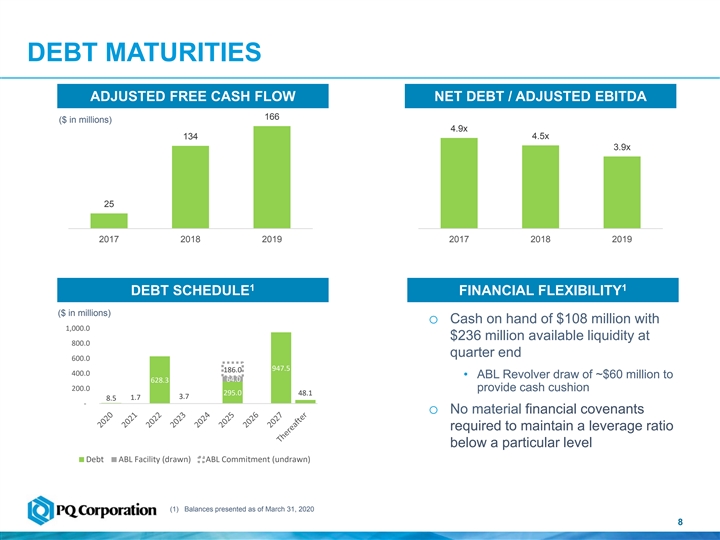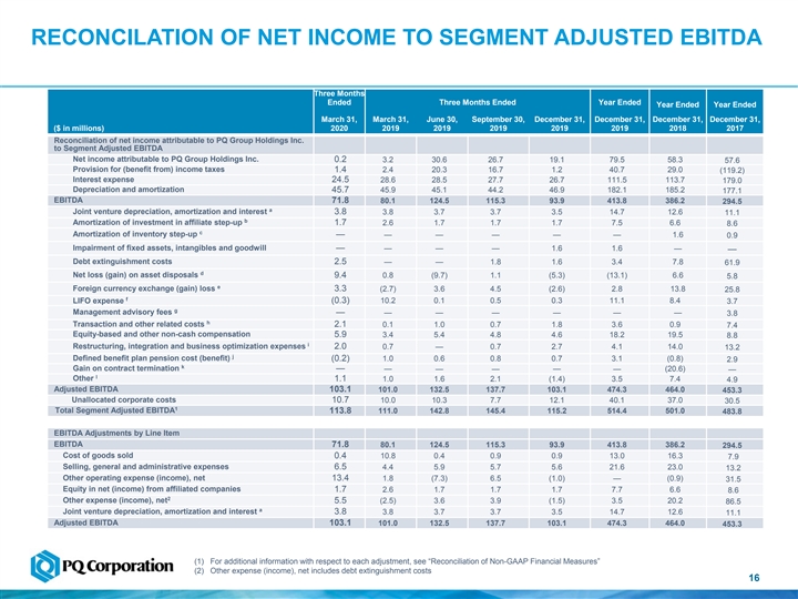 RECONCILATION OF NET INCOME TO SEGMENT ADJUSTED EBITDA Three Months Ended Three Months Ended Year Ended Year Ended Year Ended March 31, March 31, June 30, September 30, December 31, December 31, December 31, December 31, ($ in millions) 2020 2019 2019 2019 2019 2019 2018 2017 Reconciliation of net income attributable to PQ Group Holdings Inc. to Segment Adjusted EBITDA Net income attributable to PQ Group Holdings Inc. 0.2 3.2 30.6 26.7 19.1 79.5 58.3 57.6 Provision for (benefit from) income taxes 1.4 2.4 20.3 16.7 1.2 40.7 29.0 (119.2) Interest expense 24.5 28.6 28.5 27.7 26.7 111.5 113.7 179.0 Depreciation and amortization 45.7 45.9 45.1 44.2 46.9 182.1 185.2 177.1 EBITDA 71.8 80.1 124.5 115.3 93.9 413.8 386.2 294.5 a Joint venture depreciation, amortization and interest 3.8 3.8 3.7 3.7 3.5 14.7 12.6 11.1 b Amortization of investment in affiliate step-up 1.7 2.6 1.7 1.7 1.7 7.5 6.6 8.6 c Amortization of inventory step-up — — — — — — 1.6 0.9 Impairment of fixed assets, intangibles and goodwill — — — — 1.6 1.6 — — Debt extinguishment costs 2.5 — — 1.8 1.6 3.4 7.8 61.9 d Net loss (gain) on asset disposals 9.4 0.8 (9.7) 1.1 (5.3) (13.1) 6.6 5.8 e Foreign currency exchange (gain) loss 3.3 (2.7) 3.6 4.5 (2.6) 2.8 13.8 25.8 f (0.3) 10.2 0.1 0.5 0.3 11.1 8.4 LIFO expense 3.7 g Management advisory fees — — — — — — — 3.8 h Transaction and other related costs 2.1 0.1 1.0 0.7 1.8 3.6 0.9 7.4 Equity-based and other non-cash compensation 5.9 3.4 5.4 4.8 4.6 18.2 19.5 8.8 i Restructuring, integration and business optimization expenses 2.0 0.7 — 0.7 2.7 4.1 14.0 13.2 j Defined benefit plan pension cost (benefit) (0.2) 1.0 0.6 0.8 0.7 3.1 (0.8) 2.9 k Gain on contract termination — — — — — — (20.6) — l Other 1.1 1.0 1.6 2.1 (1.4) 3.5 7.4 4.9 Adjusted EBITDA 103.1 101.0 132.5 137.7 103.1 474.3 464.0 453.3 Unallocated corporate costs 10.7 10.0 10.3 7.7 12.1 40.1 37.0 30.5 1 Total Segment Adjusted EBITDA 113.8 111.0 142.8 145.4 115.2 514.4 501.0 483.8 EBITDA Adjustments by Line Item EBITDA 71.8 80.1 124.5 115.3 93.9 413.8 386.2 294.5 Cost of goods sold 0.4 10.8 0.4 0.9 0.9 13.0 16.3 7.9 Selling, general and administrative expenses 6.5 4.4 5.9 5.7 5.6 21.6 23.0 13.2 Other operating expense (income), net 13.4 1.8 (7.3) 6.5 (1.0) — (0.9) 31.5 Equity in net (income) from affiliated companies 1.7 2.6 1.7 1.7 1.7 7.7 6.6 8.6 2 Other expense (income), net 5.5 (2.5) 3.6 3.9 (1.5) 3.5 20.2 86.5 a Joint venture depreciation, amortization and interest 3.8 3.8 3.7 3.7 3.5 14.7 12.6 11.1 Adjusted EBITDA 103.1 101.0 132.5 137.7 103.1 474.3 464.0 453.3 (1) For additional information with respect to each adjustment, see “Reconciliation of Non-GAAP Financial Measures” (2) Other expense (income), net includes debt extinguishment costs 16RECONCILATION OF NET INCOME TO SEGMENT ADJUSTED EBITDA Three Months Ended Three Months Ended Year Ended Year Ended Year Ended March 31, March 31, June 30, September 30, December 31, December 31, December 31, December 31, ($ in millions) 2020 2019 2019 2019 2019 2019 2018 2017 Reconciliation of net income attributable to PQ Group Holdings Inc. to Segment Adjusted EBITDA Net income attributable to PQ Group Holdings Inc. 0.2 3.2 30.6 26.7 19.1 79.5 58.3 57.6 Provision for (benefit from) income taxes 1.4 2.4 20.3 16.7 1.2 40.7 29.0 (119.2) Interest expense 24.5 28.6 28.5 27.7 26.7 111.5 113.7 179.0 Depreciation and amortization 45.7 45.9 45.1 44.2 46.9 182.1 185.2 177.1 EBITDA 71.8 80.1 124.5 115.3 93.9 413.8 386.2 294.5 a Joint venture depreciation, amortization and interest 3.8 3.8 3.7 3.7 3.5 14.7 12.6 11.1 b Amortization of investment in affiliate step-up 1.7 2.6 1.7 1.7 1.7 7.5 6.6 8.6 c Amortization of inventory step-up — — — — — — 1.6 0.9 Impairment of fixed assets, intangibles and goodwill — — — — 1.6 1.6 — — Debt extinguishment costs 2.5 — — 1.8 1.6 3.4 7.8 61.9 d Net loss (gain) on asset disposals 9.4 0.8 (9.7) 1.1 (5.3) (13.1) 6.6 5.8 e Foreign currency exchange (gain) loss 3.3 (2.7) 3.6 4.5 (2.6) 2.8 13.8 25.8 f (0.3) 10.2 0.1 0.5 0.3 11.1 8.4 LIFO expense 3.7 g Management advisory fees — — — — — — — 3.8 h Transaction and other related costs 2.1 0.1 1.0 0.7 1.8 3.6 0.9 7.4 Equity-based and other non-cash compensation 5.9 3.4 5.4 4.8 4.6 18.2 19.5 8.8 i Restructuring, integration and business optimization expenses 2.0 0.7 — 0.7 2.7 4.1 14.0 13.2 j Defined benefit plan pension cost (benefit) (0.2) 1.0 0.6 0.8 0.7 3.1 (0.8) 2.9 k Gain on contract termination — — — — — — (20.6) — l Other 1.1 1.0 1.6 2.1 (1.4) 3.5 7.4 4.9 Adjusted EBITDA 103.1 101.0 132.5 137.7 103.1 474.3 464.0 453.3 Unallocated corporate costs 10.7 10.0 10.3 7.7 12.1 40.1 37.0 30.5 1 Total Segment Adjusted EBITDA 113.8 111.0 142.8 145.4 115.2 514.4 501.0 483.8 EBITDA Adjustments by Line Item EBITDA 71.8 80.1 124.5 115.3 93.9 413.8 386.2 294.5 Cost of goods sold 0.4 10.8 0.4 0.9 0.9 13.0 16.3 7.9 Selling, general and administrative expenses 6.5 4.4 5.9 5.7 5.6 21.6 23.0 13.2 Other operating expense (income), net 13.4 1.8 (7.3) 6.5 (1.0) — (0.9) 31.5 Equity in net (income) from affiliated companies 1.7 2.6 1.7 1.7 1.7 7.7 6.6 8.6 2 Other expense (income), net 5.5 (2.5) 3.6 3.9 (1.5) 3.5 20.2 86.5 a Joint venture depreciation, amortization and interest 3.8 3.8 3.7 3.7 3.5 14.7 12.6 11.1 Adjusted EBITDA 103.1 101.0 132.5 137.7 103.1 474.3 464.0 453.3 (1) For additional information with respect to each adjustment, see “Reconciliation of Non-GAAP Financial Measures” (2) Other expense (income), net includes debt extinguishment costs 16