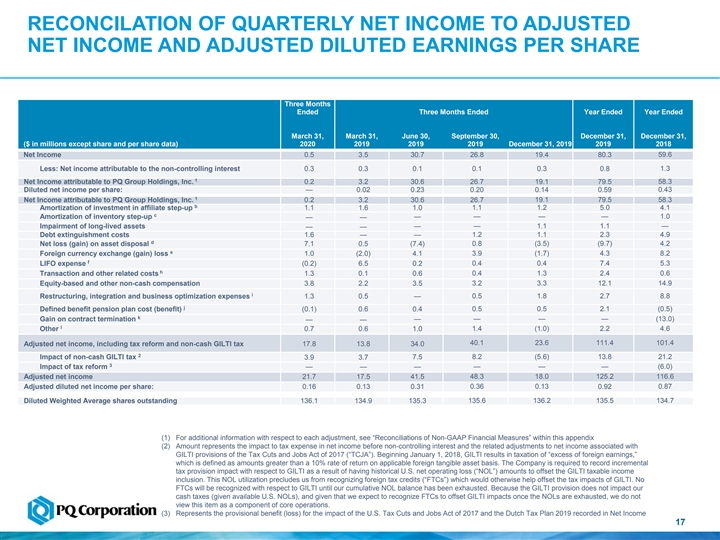 RECONCILATION OF QUARTERLY NET INCOME TO ADJUSTED NET INCOME AND ADJUSTED DILUTED EARNINGS PER SHARE Three Months Ended Three Months Ended Year Ended Year Ended March 31, March 31, June 30, September 30, December 31, December 31, ($ in millions except share and per share data) 2020 2019 2019 2019 December 31, 2019 2019 2018 Net Income 0.5 3.5 30.7 26.8 19.4 80.3 59.6 Less: Net income attributable to the non-controlling interest 0.3 0.3 0.1 0.1 0.3 0.8 1.3 1 Net Income attributable to PQ Group Holdings, Inc. 0.2 3.2 30.6 26.7 19.1 79.5 58.3 Diluted net income per share: — 0.02 0.23 0.20 0.14 0.59 0.43 1 Net Income attributable to PQ Group Holdings, Inc. 0.2 3.2 30.6 26.7 19.1 79.5 58.3 b Amortization of investment in affiliate step-up 1.1 1.6 1.0 1.1 1.2 5.0 4.1 c Amortization of inventory step-up — — — — 1.0 — — — 1.1 1.1 — Impairment of long-lived assets — — — Debt extinguishment costs 1.6 — — 1.2 1.1 2.3 4.9 d Net loss (gain) on asset disposal 7.1 0.5 (7.4) 0.8 (3.5) (9.7) 4.2 e Foreign currency exchange (gain) loss 1.0 (2.0) 4.1 3.9 (1.7) 4.3 8.2 f LIFO expense (0.2) 6.5 0.2 0.4 0.4 7.4 5.3 h Transaction and other related costs 1.3 0.1 0.6 0.4 1.3 2.4 0.6 Equity-based and other non-cash compensation 3.8 2.2 3.5 3.2 3.3 12.1 14.9 i 0.5 1.8 2.7 8.8 Restructuring, integration and business optimization expenses 1.3 0.5 — j Defined benefit pension plan cost (benefit) (0.1) 0.6 0.4 0.5 0.5 2.1 (0.5) k Gain on contract termination — — — — (13.0) — — l Other 0.7 0.6 1.0 1.4 (1.0) 2.2 4.6 40.1 23.6 111.4 101.4 Adjusted net income, including tax reform and non-cash GILTI tax 17.8 13.8 34.0 2 Impact of non-cash GILTI tax 7.5 8.2 (5.6) 13.8 21.2 3.9 3.7 3 Impact of tax reform — — — — — — (6.0) Adjusted net income 21.7 17.5 41.5 48.3 18.0 125.2 116.6 Adjusted diluted net income per share: 0.16 0.13 0.31 0.36 0.13 0.92 0.87 Diluted Weighted Average shares outstanding 136.1 134.9 135.3 135.6 136.2 135.5 134.7 (1) For additional information with respect to each adjustment, see “Reconciliations of Non-GAAP Financial Measures” within this appendix (2) Amount represents the impact to tax expense in net income before non-controlling interest and the related adjustments to net income associated with GILTI provisions of the Tax Cuts and Jobs Act of 2017 (“TCJA”). Beginning January 1, 2018, GILTI results in taxation of “excess of foreign earnings,” which is defined as amounts greater than a 10% rate of return on applicable foreign tangible asset basis. The Company is required to record incremental tax provision impact with respect to GILTI as a result of having historical U.S. net operating loss (“NOL”) amounts to offset the GILTI taxable income inclusion. This NOL utilization precludes us from recognizing foreign tax credits (“FTCs”) which would otherwise help offset the tax impacts of GILTI. No FTCs will be recognized with respect to GILTI until our cumulative NOL balance has been exhausted. Because the GILTI provision does not impact our cash taxes (given available U.S. NOLs), and given that we expect to recognize FTCs to offset GILTI impacts once the NOLs are exhausted, we do not view this item as a component of core operations. (3) Represents the provisional benefit (loss) for the impact of the U.S. Tax Cuts and Jobs Act of 2017 and the Dutch Tax Plan 2019 recorded in Net Income 17RECONCILATION OF QUARTERLY NET INCOME TO ADJUSTED NET INCOME AND ADJUSTED DILUTED EARNINGS PER SHARE Three Months Ended Three Months Ended Year Ended Year Ended March 31, March 31, June 30, September 30, December 31, December 31, ($ in millions except share and per share data) 2020 2019 2019 2019 December 31, 2019 2019 2018 Net Income 0.5 3.5 30.7 26.8 19.4 80.3 59.6 Less: Net income attributable to the non-controlling interest 0.3 0.3 0.1 0.1 0.3 0.8 1.3 1 Net Income attributable to PQ Group Holdings, Inc. 0.2 3.2 30.6 26.7 19.1 79.5 58.3 Diluted net income per share: — 0.02 0.23 0.20 0.14 0.59 0.43 1 Net Income attributable to PQ Group Holdings, Inc. 0.2 3.2 30.6 26.7 19.1 79.5 58.3 b Amortization of investment in affiliate step-up 1.1 1.6 1.0 1.1 1.2 5.0 4.1 c Amortization of inventory step-up — — — — 1.0 — — — 1.1 1.1 — Impairment of long-lived assets — — — Debt extinguishment costs 1.6 — — 1.2 1.1 2.3 4.9 d Net loss (gain) on asset disposal 7.1 0.5 (7.4) 0.8 (3.5) (9.7) 4.2 e Foreign currency exchange (gain) loss 1.0 (2.0) 4.1 3.9 (1.7) 4.3 8.2 f LIFO expense (0.2) 6.5 0.2 0.4 0.4 7.4 5.3 h Transaction and other related costs 1.3 0.1 0.6 0.4 1.3 2.4 0.6 Equity-based and other non-cash compensation 3.8 2.2 3.5 3.2 3.3 12.1 14.9 i 0.5 1.8 2.7 8.8 Restructuring, integration and business optimization expenses 1.3 0.5 — j Defined benefit pension plan cost (benefit) (0.1) 0.6 0.4 0.5 0.5 2.1 (0.5) k Gain on contract termination — — — — (13.0) — — l Other 0.7 0.6 1.0 1.4 (1.0) 2.2 4.6 40.1 23.6 111.4 101.4 Adjusted net income, including tax reform and non-cash GILTI tax 17.8 13.8 34.0 2 Impact of non-cash GILTI tax 7.5 8.2 (5.6) 13.8 21.2 3.9 3.7 3 Impact of tax reform — — — — — — (6.0) Adjusted net income 21.7 17.5 41.5 48.3 18.0 125.2 116.6 Adjusted diluted net income per share: 0.16 0.13 0.31 0.36 0.13 0.92 0.87 Diluted Weighted Average shares outstanding 136.1 134.9 135.3 135.6 136.2 135.5 134.7 (1) For additional information with respect to each adjustment, see “Reconciliations of Non-GAAP Financial Measures” within this appendix (2) Amount represents the impact to tax expense in net income before non-controlling interest and the related adjustments to net income associated with GILTI provisions of the Tax Cuts and Jobs Act of 2017 (“TCJA”). Beginning January 1, 2018, GILTI results in taxation of “excess of foreign earnings,” which is defined as amounts greater than a 10% rate of return on applicable foreign tangible asset basis. The Company is required to record incremental tax provis