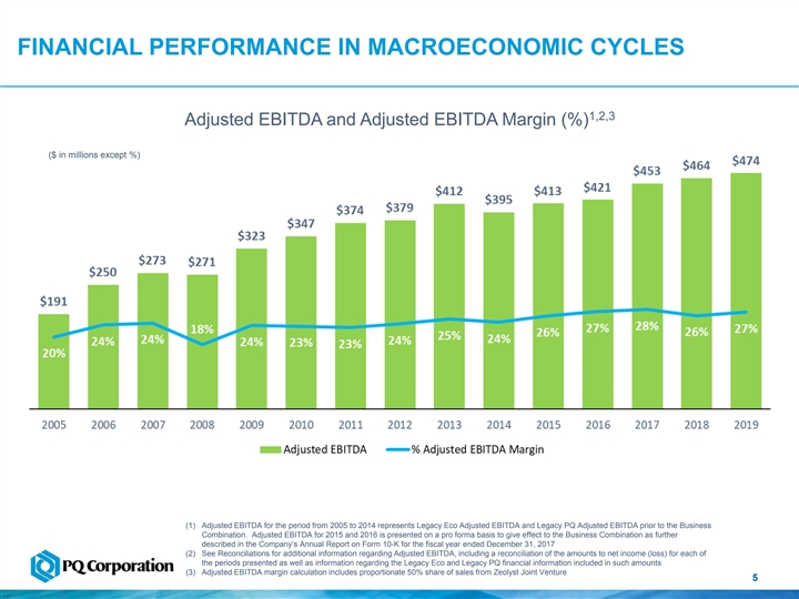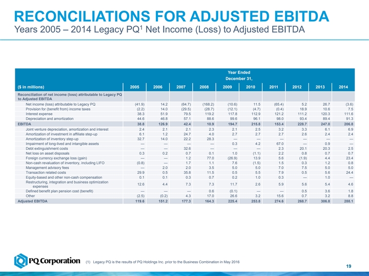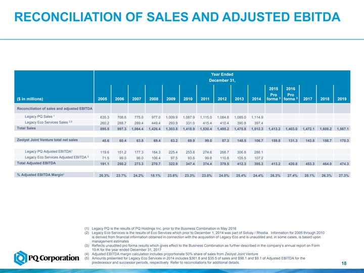 RECONCILIATION OF SALES AND ADJUSTED EBITDA Year Ended December 31, 2015 2016 Pro Pro 3 3 ($ in millions) 2005 2006 2007 2008 2009 2010 2011 2012 2013 2014 forma forma 2017 2018 2019 Reconciliation of sales and adjusted EBITDA 1 Legacy PQ Sales 635.3 708.6 775.0 977.0 1,009.9 1,087.9 1,115.0 1,084.8 1,085.0 1,114.9 2,5 Legacy Eco Services Sales 260.2 288.7 289.4 449.4 293.9 331.0 415.4 410.4 390.8 397.4 Total Sales 895.5 997.3 1,064.4 1,426.4 1,303.8 1,418.9 1,530.4 1,495.2 1,475.8 1,512.3 1,413.2 1,403.0 1,472.1 1,608.2 1,567.1 Zeolyst Joint Venture total net sales 45.6 60.4 63.8 69.4 63.2 69.9 99.0 87.3 148.5 106.7 159.8 131.3 143.8 156.7 170.3 1 Legacy PQ Adjusted EBITDA 119.6 151.2 177.3 164.3 225.4 253.8 274.6 268.7 306.8 288.1 2 Legacy Eco Services Adjusted EBITDA 71.5 99.0 96.0 106.4 97.5 93.6 99.8 110.8 105.5 107.2 Total Adjusted EBITDA 191.1 250.2 273.3 270.7 322.9 347.4 374.4 379.5 412.3 395.3 413.2 420.8 453.3 464.0 474.3 4 % Adjusted EBITDA Margin 20.3% 23.7% 24.2% 18.1% 23.6% 23.3% 23.0% 24.0% 25.4% 24.4% 26.3% 27.4% 28.1% 26.3% 27.3% (1) Legacy PQ is the results of PQ Holdings Inc. prior to the Business Combination in May 2016 (2) Legacy Eco Services is the results of Eco Services which prior to December 1, 2014 was part of Solvay / Rhodia. Information for 2005 through 2010 is derived from financial information obtained in connection with the acquisition of Legacy Eco and is unaudited and, in some cases, is based upon management estimates (3) Reflects unaudited pro forma results which gives effect to the Business Combination as further described in the company’s annual report on Form 10-K for the year ended December 31, 2017 (4) Adjusted EBITDA margin calculation includes proportionate 50% share of sales from Zeolyst Joint Venture (5) Amounts presented for Legacy Eco Services in 2014 includes $361.8 and $35.5 of sales and $98.1 and $9.1 of Adjusted EBITDA for the predecessor and successor periods, respectively. Refer to reconciliations for additional details. 18RECONCILIATION OF SALES AND ADJUSTED EBITDA Year Ended December 31, 2015 2016 Pro Pro 3 3 ($ in millions) 2005 2006 2007 2008 2009 2010 2011 2012 2013 2014 forma forma 2017 2018 2019 Reconciliation of sales and adjusted EBITDA 1 Legacy PQ Sales 635.3 708.6 775.0 977.0 1,009.9 1,087.9 1,115.0 1,084.8 1,085.0 1,114.9 2,5 Legacy Eco Services Sales 260.2 288.7 289.4 449.4 293.9 331.0 415.4 410.4 390.8 397.4 Total Sales 895.5 997.3 1,064.4 1,426.4 1,303.8 1,418.9 1,530.4 1,495.2 1,475.8 1,512.3 1,413.2 1,403.0 1,472.1 1,608.2 1,567.1 Zeolyst Joint Venture total net sales 45.6 60.4 63.8 69.4 63.2 69.9 99.0 87.3 148.5 106.7 159.8 131.3 143.8 156.7 170.3 1 Legacy PQ Adjusted EBITDA 119.6 151.2 177.3 164.3 225.4 253.8 274.6 268.7 306.8 288.1 2 Legacy Eco Services Adjusted EBITDA 71.5 99.0 96.0 106.4 97.5 93.6 99.8 110.8 105.5 107.2 Total Adjusted EBITDA 191.1 250.2 273.3 270.7 322.9 347.4 374.4 379.5 412.3 395.3 413.2 420.8 453.3 464.0 474.3 4 % Adjusted EBITDA Margin 20.3% 23.7% 24.2% 18.1% 23.6% 23.3% 23.0% 24.0% 25.4% 24.4% 26.3% 27.4% 28.1% 26.3% 27.3% (1) Legacy PQ is the results of PQ Holdings Inc. prior to the Business Combination in May 2016 (2) Legacy Eco Services is the results of Eco Services which prior to December 1, 2014 was part of Solvay / Rhodia. Information for 2005 through 2010 is derived from financial information obtained in connection with the acquisition of Legacy Eco and is unaudited and, in some cases, is based upon management estimates (3) Reflects unaudited pro forma results which gives effect to the Business Combination as further described in the company’s annual report on Form 10-K for the year ended December 31, 2017 (4) Adjusted EBITDA margin calculation includes proportionate 50% share of sales from Zeolyst Joint Venture (5) Amounts presented for Legacy Eco Services in 2014 includes $361.8 and $35.5 of sales and $98.1 and $9.1 of Adjusted EBITDA for the predecessor and successor periods, respectively. Refer to reconciliations for additional details. 18
