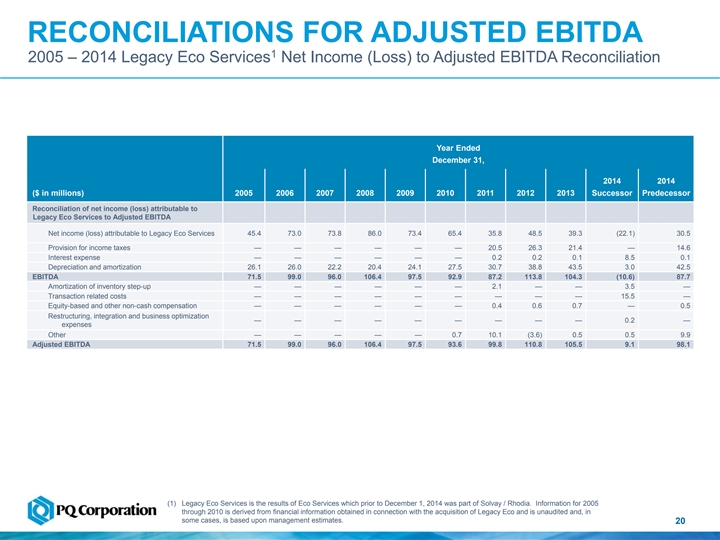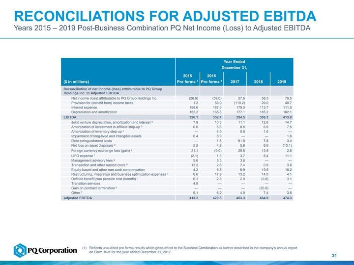 RECONCILIATIONS FOR ADJUSTED EBITDA 1 Years 2005 – 2014 Legacy PQ Net Income (Loss) to Adjusted EBITDA Year Ended December 31, ($ in millions) 2005 2006 2007 2008 2009 2010 2011 2012 2013 2014 Reconciliation of net income (loss) attributable to Legacy PQ to Adjusted EBITDA Net income (loss) attributable to Legacy PQ (41.9) 14.2 (64.7) (168.2) (10.6) 11.5 (65.4) 5.2 26.7 (3.6) Provision for (benefit from) income taxes (2.2) 14.0 (29.5) (28.7) (12.1) (4.7) (0.4) 18.9 10.6 7.5 Interest expense 38.3 51.9 79.5 119.2 117.8 112.9 121.2 111.2 120.3 111.6 Depreciation and amortization 44.6 46.8 57.1 88.6 99.6 96.1 98.0 93.4 89.4 91.3 EBITDA 38.8 126.9 42.4 10.9 194.7 215.8 153.4 228.7 247.0 206.8 Joint venture depreciation, amortization and interest 2.4 2.1 2.1 2.3 2.1 2.5 3.2 3.3 6.1 6.9 Amortization of investment in affiliate step-up 6.1 1.2 24.7 4.0 2.7 2.7 2.7 2.6 2.4 2.4 Amortization of inventory step-up 32.7 14.0 22.2 28.3 — — — — — — Impairment of long-lived and intangible assets — — — — 0.3 4.2 67.0 — 0.9 — Debt extinguishment costs — — 32.6 — — — 2.3 20.1 20.3 2.5 Net loss on asset disposals 0.3 0.2 0.7 0.1 1.0 (1.1) 2.2 0.8 0.7 0.7 Foreign currency exchange loss (gain) — — 1.2 77.0 (26.9) 13.9 5.6 (1.9) 4.4 23.4 Non-cash revaluation of inventory, including LIFO (0.8) — 1.7 1.1 7.6 (1.5) 1.5 0.3 1.2 0.8 Management advisory fees — 2.0 2.0 3.5 5.0 5.0 7.0 7.5 5.0 5.0 Transaction related costs 29.9 0.5 35.8 11.5 0.5 5.5 7.9 0.5 5.6 24.4 Equity-based and other non-cash compensation 0.1 0.1 0.3 0.7 0.2 1.0 0.3 — 1.0 — Restructuring, integration and business optimization 12.6 4.4 7.3 7.3 11.7 2.6 5.9 5.6 5.4 4.6 expenses Defined benefit plan pension cost (benefit) — — — 0.6 (0.1) — — 0.5 3.6 1.8 Other (2.5) (0.2) 4.3 17.0 26.6 3.2 15.6 0.7 3.2 8.8 Adjusted EBITDA 119.6 151.2 177.3 164.3 225.4 253.8 274.6 268.7 306.8 288.1 (1) Legacy PQ is the results of PQ Holdings Inc. prior to the Business Combination in May 2016 19RECONCILIATIONS FOR ADJUSTED EBITDA 1 Years 2005 – 2014 Legacy PQ Net Income (Loss) to Adjusted EBITDA Year Ended December 31, ($ in millions) 2005 2006 2007 2008 2009 2010 2011 2012 2013 2014 Reconciliation of net income (loss) attributable to Legacy PQ to Adjusted EBITDA Net income (loss) attributable to Legacy PQ (41.9) 14.2 (64.7) (168.2) (10.6) 11.5 (65.4) 5.2 26.7 (3.6) Provision for (benefit from) income taxes (2.2) 14.0 (29.5) (28.7) (12.1) (4.7) (0.4) 18.9 10.6 7.5 Interest expense 38.3 51.9 79.5 119.2 117.8 112.9 121.2 111.2 120.3 111.6 Depreciation and amortization 44.6 46.8 57.1 88.6 99.6 96.1 98.0 93.4 89.4 91.3 EBITDA 38.8 126.9 42.4 10.9 194.7 215.8 153.4 228.7 247.0 206.8 Joint venture depreciation, amortization and interest 2.4 2.1 2.1 2.3 2.1 2.5 3.2 3.3 6.1 6.9 Amortization of investment in affiliate step-up 6.1 1.2 24.7 4.0 2.7 2.7 2.7 2.6 2.4 2.4 Amortization of inventory step-up 32.7 14.0 22.2 28.3 — — — — — — Impairment of long-lived and intangible assets — — — — 0.3 4.2 67.0 — 0.9 — Debt extinguishment costs — — 32.6 — — — 2.3 20.1 20.3 2.5 Net loss on asset disposals 0.3 0.2 0.7 0.1 1.0 (1.1) 2.2 0.8 0.7 0.7 Foreign currency exchange loss (gain) — — 1.2 77.0 (26.9) 13.9 5.6 (1.9) 4.4 23.4 Non-cash revaluation of inventory, including LIFO (0.8) — 1.7 1.1 7.6 (1.5) 1.5 0.3 1.2 0.8 Management advisory fees — 2.0 2.0 3.5 5.0 5.0 7.0 7.5 5.0 5.0 Transaction related costs 29.9 0.5 35.8 11.5 0.5 5.5 7.9 0.5 5.6 24.4 Equity-based and other non-cash compensation 0.1 0.1 0.3 0.7 0.2 1.0 0.3 — 1.0 — Restructuring, integration and business optimization 12.6 4.4 7.3 7.3 11.7 2.6 5.9 5.6 5.4 4.6 expenses Defined benefit plan pension cost (benefit) — — — 0.6 (0.1) — — 0.5 3.6 1.8 Other (2.5) (0.2) 4.3 17.0 26.6 3.2 15.6 0.7 3.2 8.8 Adjusted EBITDA 119.6 151.2 177.3 164.3 225.4 253.8 274.6 268.7 306.8 288.1 (1) Legacy PQ is the results of PQ Holdings Inc. prior to the Business Combination in May 2016 19