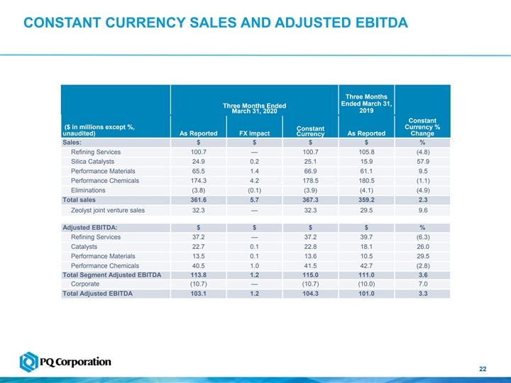 CONSTANT CURRENCY SALES AND ADJUSTED EBITDA Three Months Ended March 31, Three Months Ended 2019 March 31, 2020 Constant ($ in millions except %, Currency % Constant unaudited) As Reported FX Impact As Reported Change Currency Sales: $ $ $ $ % Refining Services 100.7 — 100.7 105.8 (4.8) Silica Catalysts 24.9 0.2 25.1 15.9 57.9 Performance Materials 65.5 1.4 66.9 61.1 9.5 Performance Chemicals 174.3 4.2 178.5 180.5 (1.1) Eliminations (3.8) (0.1) (3.9) (4.1) (4.9) Total sales 361.6 5.7 367.3 359.2 2.3 Zeolyst joint venture sales 32.3 — 32.3 29.5 9.6 Adjusted EBITDA: $ $ $ $ % Refining Services 37.2 — 37.2 39.7 (6.3) Catalysts 22.7 0.1 22.8 18.1 26.0 Performance Materials 13.5 0.1 13.6 10.5 29.5 Performance Chemicals 40.5 1.0 41.5 42.7 (2.8) Total Segment Adjusted EBITDA 113.8 1.2 115.0 111.0 3.6 Corporate (10.7) — (10.7) (10.0) 7.0 Total Adjusted EBITDA 103.1 1.2 104.3 101.0 3.3 22CONSTANT CURRENCY SALES AND ADJUSTED EBITDA Three Months Ended March 31, Three Months Ended 2019 March 31, 2020 Constant ($ in millions except %, Currency % Constant unaudited) As Reported FX Impact As Reported Change Currency Sales: $ $ $ $ % Refining Services 100.7 — 100.7 105.8 (4.8) Silica Catalysts 24.9 0.2 25.1 15.9 57.9 Performance Materials 65.5 1.4 66.9 61.1 9.5 Performance Chemicals 174.3 4.2 178.5 180.5 (1.1) Eliminations (3.8) (0.1) (3.9) (4.1) (4.9) Total sales 361.6 5.7 367.3 359.2 2.3 Zeolyst joint venture sales 32.3 — 32.3 29.5 9.6 Adjusted EBITDA: $ $ $ $ % Refining Services 37.2 — 37.2 39.7 (6.3) Catalysts 22.7 0.1 22.8 18.1 26.0 Performance Materials 13.5 0.1 13.6 10.5 29.5 Performance Chemicals 40.5 1.0 41.5 42.7 (2.8) Total Segment Adjusted EBITDA 113.8 1.2 115.0 111.0 3.6 Corporate (10.7) — (10.7) (10.0) 7.0 Total Adjusted EBITDA 103.1 1.2 104.3 101.0 3.3 22