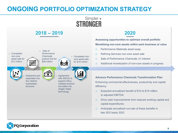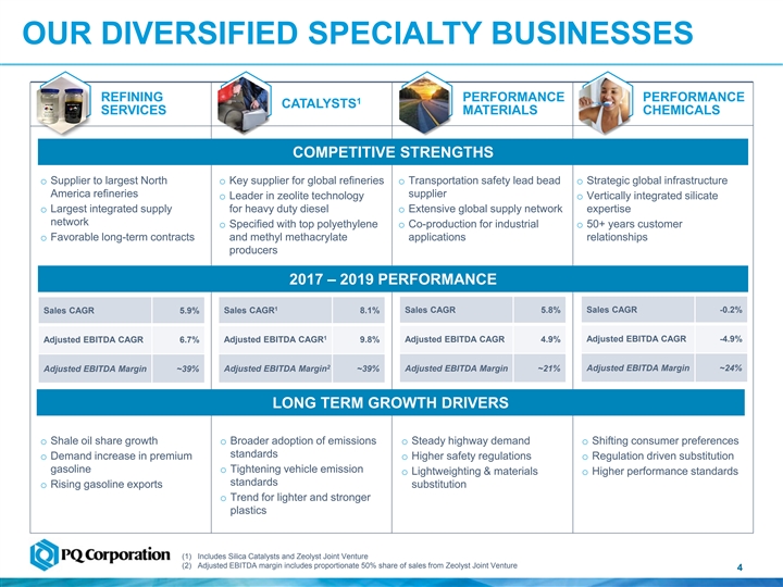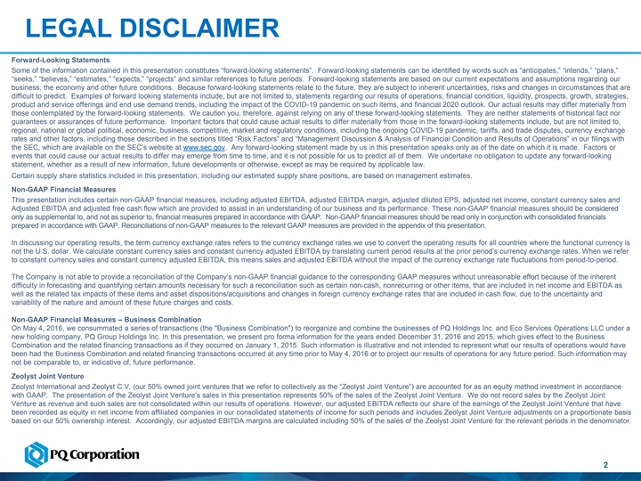 LEGAL DISCLAIMER Forward-Looking Statements Some of the information contained in this presentation constitutes “forward-looking statements”. Forward-looking statements can be identified by words such as “anticipates,” “intends,” “plans,” “seeks,” “believes,” “estimates,” “expects,” “projects” and similar references to future periods. Forward-looking statements are based on our current expectations and assumptions regarding our business, the economy and other future conditions. Because forward-looking statements relate to the future, they are subject to inherent uncertainties, risks and changes in circumstances that are difficult to predict. Examples of forward looking statements include, but are not limited to, statements regarding our results of operations, financial condition, liquidity, prospects, growth, strategies, product and service offerings and end use demand trends, including the impact of the COVID-19 pandemic on such items, and financial 2020 outlook. Our actual results may differ materially from those contemplated by the forward-looking statements. We caution you, therefore, against relying on any of these forward-looking statements. They are neither statements of historical fact nor guarantees or assurances of future performance. Important factors that could cause actual results to differ materially from those in the forward-looking statements include, but are not limited to, regional, national or global political, economic, business, competitive, market and regulatory conditions, including the ongoing COVID-19 pandemic, tariffs, and trade disputes, currency exchange rates and other factors, including those described in the sections titled “Risk Factors” and “Management Discussion & Analysis of Financial Condition and Results of Operations” in our filings with the SEC, which are available on the SEC’s website at www.sec.gov. Any forward-looking statement made by us in this presentation speaks only as of the date on which it is made. Factors or events that could cause our actual results to differ may emerge from time to time, and it is not possible for us to predict all of them. We undertake no obligation to update any forward-looking statement, whether as a result of new information, future developments or otherwise, except as may be required by applicable law. Certain supply share statistics included in this presentation, including our estimated supply share positions, are based on management estimates. Non-GAAP Financial Measures This presentation includes certain non-GAAP financial measures, including adjusted EBITDA, adjusted EBITDA margin, adjusted diluted EPS, adjusted net income, constant currency sales and Adjusted EBITDA and adjusted free cash flow which are provided to assist in an understanding of our business and its performance. These non-GAAP financial measures should be considered only as supplemental to, and not as superior to, financial measures prepared in accordance with GAAP. Non-GAAP financial measures should be read only in conjunction with consolidated financials prepared in accordance with GAAP. Reconciliations of non-GAAP measures to the relevant GAAP measures are provided in the appendix of this presentation. In discussing our operating results, the term currency exchange rates refers to the currency exchange rates we use to convert the operating results for all countries where the functional currency is not the U.S. dollar. We calculate constant currency sales and constant currency adjusted EBITDA by translating current period results at the prior period’s currency exchange rates. When we refer to constant currency sales and constant currency adjusted EBITDA, this means sales and adjusted EBITDA without the impact of the currency exchange rate fluctuations from period-to-period. The Company is not able to provide a reconciliation of the Company’s non-GAAP financial guidance to the corresponding GAAP measures without unreasonable effort because of the inherent difficulty in forecasting and quantifying certain amounts necessary for such a reconciliation such as certain non-cash, nonrecurring or other items, that are included in net income and EBITDA as well as the related tax impacts of these items and asset dispositions/acquisitions and changes in foreign currency exchange rates that are included in cash flow, due to the uncertainty and variability of the nature and amount of these future charges and costs. Non-GAAP Financial Measures – Business Combination On May 4, 2016, we consummated a series of transactions (the Business Combination ) to reorganize and combine the businesses of PQ Holdings Inc. and Eco Services Operations LLC under a new holding company, PQ Group Holdings Inc. In this presentation, we present pro forma information for the years ended December 31, 2016 and 2015, which gives effect to the Business Combination and the related financing transactions as if they occurred on January 1, 2015. Such information is illustrative and not intended to represent what our results of operations would have been had the Business Combination and related financing transactions occurred at any time prior to May 4, 2016 or to project our results of operations for any future period. Such information may not be comparable to, or indicative of, future performance. Zeolyst Joint Venture Zeolyst International and Zeolyst C.V. (our 50% owned joint ventures that we refer to collectively as the “Zeolyst Joint Venture”) are accounted for as an equity method investment in accordance with GAAP. The presentation of the Zeolyst Joint Venture’s sales in this presentation represents 50% of the sales of the Zeolyst Joint Venture. We do not record sales by the Zeolyst Joint Venture as revenue and such sales are not consolidated within our results of operations. However, our adjusted EBITDA reflects our share of the earnings of the Zeolyst Joint Venture that have been recorded as equity in net income from affil
