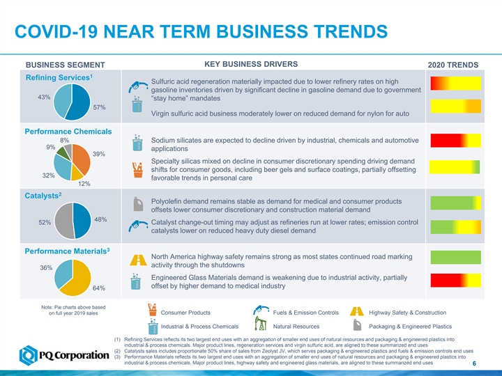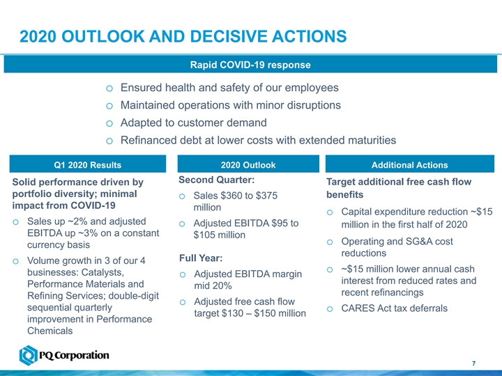 COVID-19 NEAR TERM BUSINESS TRENDS KEY BUSINESS DRIVERS BUSINESS SEGMENT 2020 TRENDS 1 Refining Services Sulfuric acid regeneration materially impacted due to lower refinery rates on high gasoline inventories driven by significant decline in gasoline demand due to government 43% “stay home” mandates 57% Virgin sulfuric acid business moderately lower on reduced demand for nylon for auto Performance Chemicals 8% Sodium silicates are expected to decline driven by industrial, chemicals and automotive 9% applications 39% Specialty silicas mixed on decline in consumer discretionary spending driving demand shifts for consumer goods, including beer gels and surface coatings, partially offsetting 32% favorable trends in personal care 12% 2 Catalysts Polyolefin demand remains stable as demand for medical and consumer products offsets lower consumer discretionary and construction material demand 48% 52% Catalyst change-out timing may adjust as refineries run at lower rates; emission control catalysts lower on reduced heavy duty diesel demand 3 Performance Materials North America highway safety remains strong as most states continued road marking activity through the shutdowns 36% Engineered Glass Materials demand is weakening due to industrial activity, partially offset by higher demand to medical industry 64% Note: Pie charts above based on full year 2019 sales Consumer Products Fuels & Emission Controls Highway Safety & Construction Industrial & Process Chemicals Natural Resources Packaging & Engineered Plastics (1) Refining Services reflects its two largest end uses with an aggregation of smaller end uses of natural resources and packaging & engineered plastics into industrial & process chemicals. Major product lines, regeneration services and virgin sulfuric acid, are aligned to these summarized end uses (2) Catalysts sales includes proportionate 50% share of sales from Zeolyst JV, which serves packaging & engineered plastics and fuels & emission controls end uses (3) Performance Materials reflects its two largest end uses with an aggregation of smaller end uses of natural resources and packaging & engineered plastics into industrial & process chemicals. Major product lines, highway safety and engineered glass materials, are aligned to these summarized end uses 6COVID-19 NEAR TERM BUSINESS TRENDS KEY BUSINESS DRIVERS BUSINESS SEGMENT 2020 TRENDS 1 Refining Services Sulfuric acid regeneration materially impacted due to lower refinery rates on high gasoline inventories driven by significant decline in gasoline demand due to government 43% “stay home” mandates 57% Virgin sulfuric acid business moderately lower on reduced demand for nylon for auto Performance Chemicals 8% Sodium silicates are expected to decline driven by industrial, chemicals and automotive 9% applications 39% Specialty silicas mixed on decline in consumer discretionary spending driving demand shifts for consumer goods, including beer gels and surface coatings, partially offsetting 32% favorable trends in personal care 12% 2 Catalysts Polyolefin demand remains stable as demand for medical and consumer products offsets lower consumer discretionary and construction material demand 48% 52% Catalyst change-out timing may adjust as refineries run at lower rates; emission control catalysts lower on reduced heavy duty diesel demand 3 Performance Materials North America highway safety remains strong as most states continued road marking activity through the shutdowns 36% Engineered Glass Materials demand is weakening due to industrial activity, partially offset by higher demand to medical industry 64% Note: Pie charts above based on full year 2019 sales Consumer Products Fuels & Emission Controls Highway Safety & Construction Industrial & Process Chemicals Natural Resources Packaging & Engineered Plastics (1) Refining Services reflects its two largest end uses with an aggregation of smaller end uses of natural resources and packaging & engineered plastics into industrial & process chemicals. Major product lines, regeneration services and virgin sulfuric acid, are aligned to these summarized end uses (2) Catalysts sales includes proportionate 50% share of sales from Zeolyst JV, which serves packaging & engineered plastics and fuels & emission controls end uses (3) Performance Materials reflects its two largest end uses with an aggregation of smaller end uses of natural resources and packaging & engineered plastics into industrial & process chemicals. Major product lines, highway safety and engineered glass materials, are aligned to these summarized end uses 6