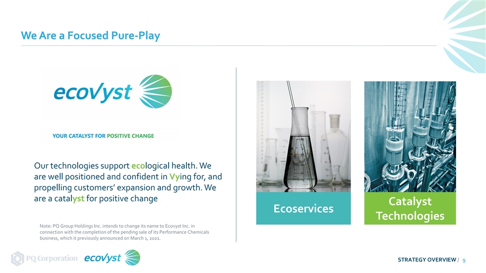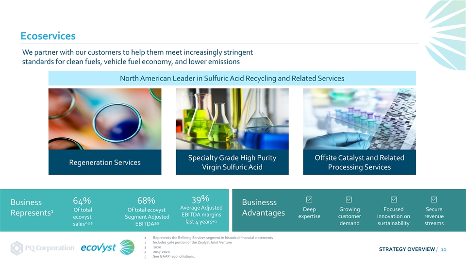 We Are a Focused Pure-Play Our technologies support ecological health. We are well positioned and confident in Vying for, and propelling customers’ expansion and growth. We are a catalyst for positive change Catalyst Ecoservices Technologies Note: PQ Group Holdings Inc. intends to change its name to Ecovyst Inc. in connection with the completion of the pending sale of its Performance Chemicals business, which it previously announced on March 1, 2021. STRATEGY OVERVIEW / 9We Are a Focused Pure-Play Our technologies support ecological health. We are well positioned and confident in Vying for, and propelling customers’ expansion and growth. We are a catalyst for positive change Catalyst Ecoservices Technologies Note: PQ Group Holdings Inc. intends to change its name to Ecovyst Inc. in connection with the completion of the pending sale of its Performance Chemicals business, which it previously announced on March 1, 2021. STRATEGY OVERVIEW / 9