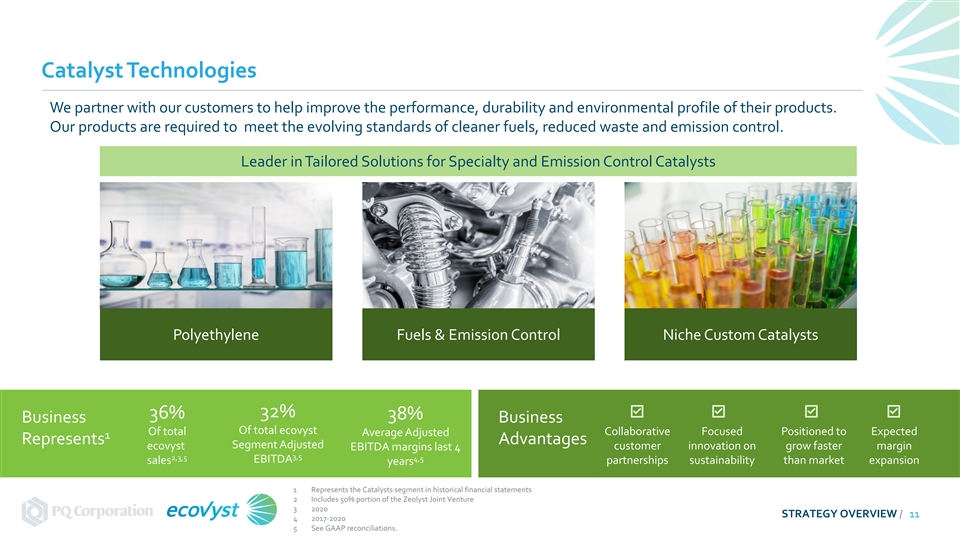 Ecoservices We partner with our customers to help them meet increasingly stringent standards for clean fuels, vehicle fuel economy, and lower emissions North American Leader in Sulfuric Acid Recycling and Related Services Specialty Grade High Purity Offsite Catalyst and Related Regeneration Services Virgin Sulfuric Acid Processing Services 39% 64% 68% Business Businesss Average Adjusted Deep Growing Focused Secure Of total Of total ecovyst 1 Represents Advantages EBITDA margins expertise customer innovation on revenue ecovyst Segment Adjusted 4,5 last 4 years 2,3,5 3,5 demand sustainability streams sales EBITDA 1 Represents the Refining Services segment in historical financial statements 2 Includes 50% portion of the Zeolyst Joint Venture 3 2020 STRATEGY OVERVIEW / 10 4 2017-2020 5 See GAAP reconciliations.Ecoservices We partner with our customers to help them meet increasingly stringent standards for clean fuels, vehicle fuel economy, and lower emissions North American Leader in Sulfuric Acid Recycling and Related Services Specialty Grade High Purity Offsite Catalyst and Related Regeneration Services Virgin Sulfuric Acid Processing Services 39% 64% 68% Business Businesss Average Adjusted Deep Growing Focused Secure Of total Of total ecovyst 1 Represents Advantages EBITDA margins expertise customer innovation on revenue ecovyst Segment Adjusted 4,5 last 4 years 2,3,5 3,5 demand sustainability streams sales EBITDA 1 Represents the Refining Services segment in historical financial statements 2 Includes 50% portion of the Zeolyst Joint Venture 3 2020 STRATEGY OVERVIEW / 10 4 2017-2020 5 See GAAP reconciliations.