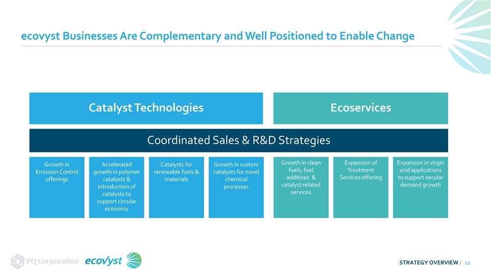 Catalyst Technologies We partner with our customers to help improve the performance, durability and environmental profile of their products. Our products are required to meet the evolving standards of cleaner fuels, reduced waste and emission control. Leader in Tailored Solutions for Specialty and Emission Control Catalysts Polyethylene Fuels & Emission Control Niche Custom Catalysts 32% 36% 38% Business Business Of total ecovyst Of total Collaborative Focused Positioned to Expected Average Adjusted 1 Represents Advantages Segment Adjusted ecovyst EBITDA margins last 4 customer innovation on grow faster margin 3,5 2,3,5 4,5 EBITDA sales partnerships sustainability than market expansion years 1 Represents the Catalysts segment in historical financial statements 2 Includes 50% portion of the Zeolyst Joint Venture 3 2020 STRATEGY OVERVIEW / 11 4 2017-2020 5 See GAAP reconciliations.Catalyst Technologies We partner with our customers to help improve the performance, durability and environmental profile of their products. Our products are required to meet the evolving standards of cleaner fuels, reduced waste and emission control. Leader in Tailored Solutions for Specialty and Emission Control Catalysts Polyethylene Fuels & Emission Control Niche Custom Catalysts 32% 36% 38% Business Business Of total ecovyst Of total Collaborative Focused Positioned to Expected Average Adjusted 1 Represents Advantages Segment Adjusted ecovyst EBITDA margins last 4 customer innovation on grow faster margin 3,5 2,3,5 4,5 EBITDA sales partnerships sustainability than market expansion years 1 Represents the Catalysts segment in historical financial statements 2 Includes 50% portion of the Zeolyst Joint Venture 3 2020 STRATEGY OVERVIEW / 11 4 2017-2020 5 See GAAP reconciliations.