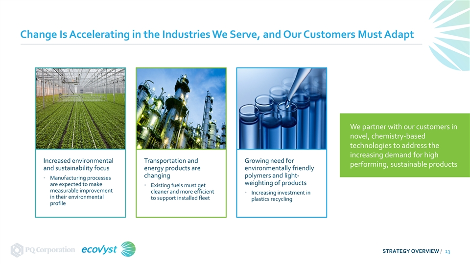 ecovyst Businesses Are Complementary and Well Positioned to Enable Change Catalyst Technologies Ecoservices Coordinated Sales & R&D Strategies Growth in clean Expansion of Expansion in virgin Growth in Accelerated Catalysts for Growth in custom fuels, fuel Treatment acid applications Emission Control growth in polymer renewable fuels & catalysts for novel additives & Services offering to support secular offerings catalysts & materials chemical catalyst related demand growth introduction of processes services catalysts to support circular economy STRATEGY OVERVIEW / 12ecovyst Businesses Are Complementary and Well Positioned to Enable Change Catalyst Technologies Ecoservices Coordinated Sales & R&D Strategies Growth in clean Expansion of Expansion in virgin Growth in Accelerated Catalysts for Growth in custom fuels, fuel Treatment acid applications Emission Control growth in polymer renewable fuels & catalysts for novel additives & Services offering to support secular offerings catalysts & materials chemical catalyst related demand growth introduction of processes services catalysts to support circular economy STRATEGY OVERVIEW / 12