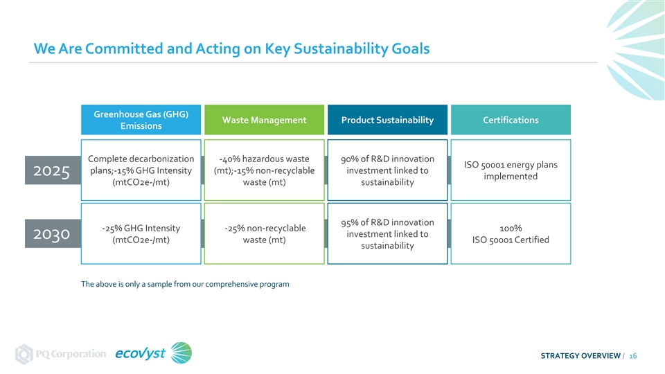 Portfolio Serving Long-Term Sustainable Trends • Very low environmental footprint compared to published peer data • Gaining momentum in our journey to achieve sustainability improvements ECOSERVICES CATALYST TECHNOLOGIES Recyclability Largest North American recycler of spentsulfuric acid, Removes sulfur from diesel fuel for landand avoiding 1.5 million tons per year of landfill or deep marine transportation Efficient Energy Usage well disposal Provides active component for > 90% reduction One of the largest consumers of refinery spent sulfur, of NOx emissions from diesel engines Emissions converting for other uses Provides technology to support chemical recycling of Innovation Converts by-product steam into 17MW/h of electricity polyethylene used internally, with excess exported to grid 80% of 2020 R&D investment in product innovation World class low SO₂ emissions linked to sustainability CLEAN ENERGY TRANSITION: Evolving Fuels, Emission Reductions & Energy Storage CIRCULAR PLASTICS ECONOMY: Lightweighting, Strengthening & Recycling STRATEGY OVERVIEW / 15Portfolio Serving Long-Term Sustainable Trends • Very low environmental footprint compared to published peer data • Gaining momentum in our journey to achieve sustainability improvements ECOSERVICES CATALYST TECHNOLOGIES Recyclability Largest North American recycler of spentsulfuric acid, Removes sulfur from diesel fuel for landand avoiding 1.5 million tons per year of landfill or deep marine transportation Efficient Energy Usage well disposal Provides active component for > 90% reduction One of the largest consumers of refinery spent sulfur, of NOx emissions from diesel engines Emissions converting for other uses Provides technology to support chemical recycling of Innovation Converts by-product steam into 17MW/h of electricity polyethylene used internally, with excess exported to grid 80% of 2020 R&D investment in product innovation World class low SO₂ emissions linked to sustainability CLEAN ENERGY TRANSITION: Evolving Fuels, Emission Reductions & Energy Storage CIRCULAR PLASTICS ECONOMY: Lightweighting, Strengthening & Recycling STRATEGY OVERVIEW / 15