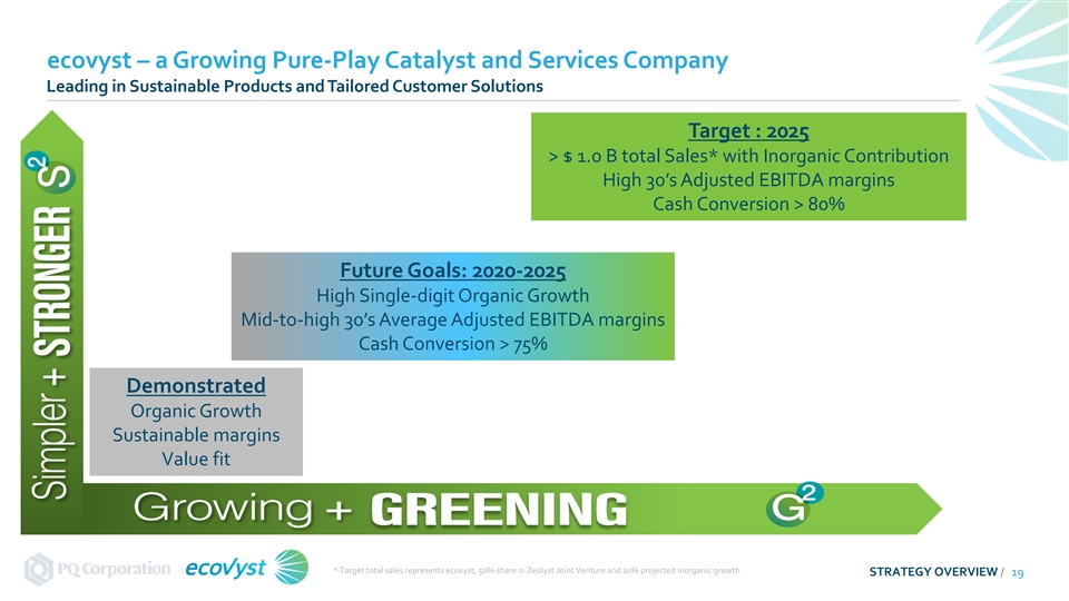 ecovyst – a Growing Pure-Play Catalyst and Services Company Leading in Sustainable Products and Tailored Customer Solutions Target : 2025 > $ 1.0 B total Sales* with Inorganic Contribution High 30’s Adjusted EBITDA margins Cash Conversion > 80% Our Past 2025 Goals • Demonstrated Organic Growth Future Goals: 2020-2025 • Sustainable Margins High Single-digit Organic Growth • Value Fit Mid-to-high 30’s Average Adjusted EBITDA margins Cash Conversion > 75% Demonstrated Organic Growth Sustainable margins Value fit * Target total sales represents ecovyst, 50% share in Zeolyst Joint Venture and 10% projected inorganic growth STRATEGY OVERVIEW / 19ecovyst – a Growing Pure-Play Catalyst and Services Company Leading in Sustainable Products and Tailored Customer Solutions Target : 2025 > $ 1.0 B total Sales* with Inorganic Contribution High 30’s Adjusted EBITDA margins Cash Conversion > 80% Our Past 2025 Goals • Demonstrated Organic Growth Future Goals: 2020-2025 • Sustainable Margins High Single-digit Organic Growth • Value Fit Mid-to-high 30’s Average Adjusted EBITDA margins Cash Conversion > 75% Demonstrated Organic Growth Sustainable margins Value fit * Target total sales represents ecovyst, 50% share in Zeolyst Joint Venture and 10% projected inorganic growth STRATEGY OVERVIEW / 19