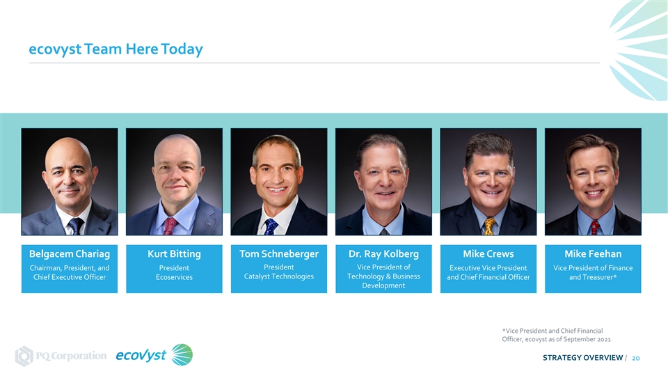 ecovyst Team Here Today Belgacem Chariag Kurt Bitting Tom Schneberger Dr. Ray Kolberg Mike Crews Mike Feehan President Vice President of Chairman, President, and President Executive Vice President Vice President of Finance Catalyst Technologies Technology & Business Chief Executive Officer Ecoservices and Chief Financial Officer and Treasurer* Development *Vice President and Chief Financial Officer, ecovyst as of September 2021 STRATEGY OVERVIEW / 20ecovyst Team Here Today Belgacem Chariag Kurt Bitting Tom Schneberger Dr. Ray Kolberg Mike Crews Mike Feehan President Vice President of Chairman, President, and President Executive Vice President Vice President of Finance Catalyst Technologies Technology & Business Chief Executive Officer Ecoservices and Chief Financial Officer and Treasurer* Development *Vice President and Chief Financial Officer, ecovyst as of September 2021 STRATEGY OVERVIEW / 20