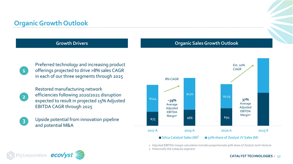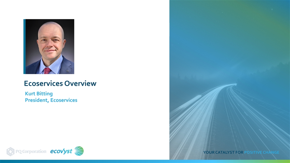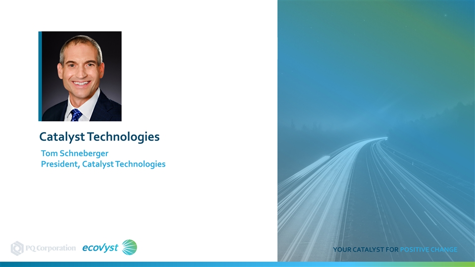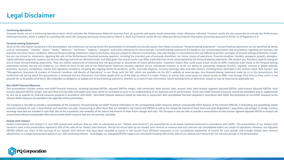 Legal Disclaimer ContinuingOperations Financial results are on a continuing operations basis, which excludes the Performance Materials business from all quarterly and yearly results presented, unless otherwise indicated. Financial results are also presented to exclude the Performance Chemicalsbusiness,whichissubjecttoapendingsalewhichtheCompanypreviouslyannouncedonMarch1,2021,butfinancialresultsdonotreflectproformafinancialinformationpresentedpursuanttoArticle11ofRegulationS-X. Forward-LookingStatements Some of theinformation containedin thispresentation, the conference call during which thispresentationisreviewed and any discussions that followconstitutes“forward-looking statements”. Forward-looking statements can beidentified by words such as“anticipates,”“intends,”“plans,”“seeks,”“believes,”“estimates,”“expects,”“projects” and similar referencestofuture periods. Forward-looking statements arebased on our currentexpectations and assumptionsregarding ourbusiness, the economyandotherfutureconditions.Becauseforward-lookingstatementsrelatetothefuture,theyaresubjecttoinherentuncertainties,risksandchangesincircumstancesthataredifficulttopredict.Examplesofforwardlookingstatementsinclude, but are not limited to, statements regarding the sale of the Performance Chemicals business segment, including the intended uses of proceeds therefrom, our future results of operations, financial condition, liquidity, prospects, growth, strategies, capitalallocationprograms,productandserviceofferingsandendusedemandtrends,and2025goals.Ouractualresultsmaydiffermateriallyfromthosecontemplatedbytheforward-lookingstatements.Wecautionyou,therefore,againstrelyingon any of these forward-looking statements. They are neither statements of historical fact nor guarantees or assurances of future performance. Important factors that could cause actual results to differ materially from those in the forward-looking statements include, but are not limited to, our ability to close on the sale of the Performance Chemicals business segment on our anticipated timeline, or at all, our ability to successfully integrate Chem32, regional, national or global political, economic, business, competitive, market and regulatory conditions, including the ongoing COVID-19 pandemic, tariffs, and trade disputes, currency exchange rates and other factors, including those described in the sections titled “Risk Factors” and “Management Discussion & Analysis of Financial Condition and Results of Operations” in our filings with the SEC, which are available on the SEC’s website at www.sec.gov. Any forward-looking statement made by us in this presentation, the conference call during which this presentation is reviewed and any discussions that follow speaks only as of the date on which it is made. Factors or events that could cause our actual results to differ may emerge from time to time, and it is not possibleforustopredictallofthem.Weundertakenoobligationtoupdateanyforward-lookingstatement,whetherasaresultofnewinformation,futuredevelopmentsorotherwise,exceptasmayberequiredbyapplicablelaw. Non-GAAPFinancialMeasures This presentation includes certain non-GAAP financial measures, including adjusted EBITDA, adjusted EBITDA margin, cash conversion, total ecovyst sales, ecovyst sales, total ecovyst segment adjusted EBITDA, total ecovyst adjusted EBITDA, total ecovyst adjusted EBITDA margin, free cash flowand net debt and target total sales, which are provided to assist in an understanding of our business and its performance. These non-GAAP financial measures should be consideredonly assupplemental to, and not as superior to, financial measures prepared in accordance with GAAP. Non-GAAP financial measures should be read only in conjunction with consolidated financials prepared in accordance with GAAP. Reconciliations of non-GAAP measures to the relevantGAAPmeasuresareprovidedintheappendixofthispresentation. The Company is not able to provide a reconciliation of the Company's forward-looking non-GAAP financial information to the corresponding GAAP measures without unreasonable effort because of the inherent difficulty in forecasting and quantifying certain amounts necessary for sucha reconciliation such ascertain non-cash, nonrecurring or other items that are included in net income and EBITDA as well as the related tax impacts of these items and asset dispositions/ acquisitions and changes in foreign currency exchange rates that are included in cash flow, due to the uncertainty and variability of the nature and amount of these future charges and costs. The Company is also not able to providea reconciliation of total ecovyst segment adjusted EBITDA to ecovyst net income(loss)withoutunreasonableeffortduetocertainGAAPmeasuresthatarenotcurrently calculable. ZeolystJointVenture Zeolyst International and Zeolyst C.V. (our 50% owned joint ventures that we refer to collectively as our “Zeolyst Joint Venture”) are accounted for as an equity method investment in accordance with GAAP. The presentation of our Zeolyst Joint Venture’ssalesinthispresentationrepresents50%ofthesalesofourZeolystJointVenture. WedonotrecordsalesbyourZeolystJointVentureasrevenueandsuchsalesarenotconsolidatedwithinourresultsofoperations.However,ourAdjusted EBITDA reflects our share of the earnings of our Zeolyst Joint Venture that have been recorded as equity in net income from affiliated companies in our consolidated statements of income for such periods and includes Zeolyst Joint Venture adjustmentsonaproportionatebasisbasedonour50%ownershipinterest. Accordingly,ourAdjustedEBITDAmarginsarecalculatedincluding50%ofthesalesofourZeolystJointVenturefortherelevantperiodsinthedenominator.Legal Disclaimer ContinuingOperations Financial results are on a continuing operations basis, which excludes the Performance Materials business from all quarterly and yearly results presented, unless otherwise indicated. Financial results are also presented to exclu