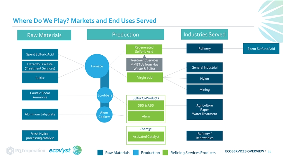 Ecoservices Product Lines 1 2 Regeneration Virgin Sulfuric Acid & Sulfur Products • Regeneration for Refinery Alkylation Units • North American leading producer (virgin acid) • Chemical spent regeneration • Oleum • Industry leader • Electrolyte grades • 35% expansion of Gulf Coast • Dilute Acid capacity since 2016 • Sulfur CoProducts Ecoservices Business Units 4 3 Chem32 Treatment Services • Leading Ex-Situ Catalyst • Converts waste into energy Activation Provider • Hazardous / Non-Hazardous • Hydro-processing • Primary Gulf Coast • International sales • Renewable fuels ECOSERVICES OVERVIEW / 24Ecoservices Product Lines 1 2 Regeneration Virgin Sulfuric Acid & Sulfur Products • Regeneration for Refinery Alkylation Units • North American leading producer (virgin acid) • Chemical spent regeneration • Oleum • Industry leader • Electrolyte grades • 35% expansion of Gulf Coast • Dilute Acid capacity since 2016 • Sulfur CoProducts Ecoservices Business Units 4 3 Chem32 Treatment Services • Leading Ex-Situ Catalyst • Converts waste into energy Activation Provider • Hazardous / Non-Hazardous • Hydro-processing • Primary Gulf Coast • International sales • Renewable fuels ECOSERVICES OVERVIEW / 24