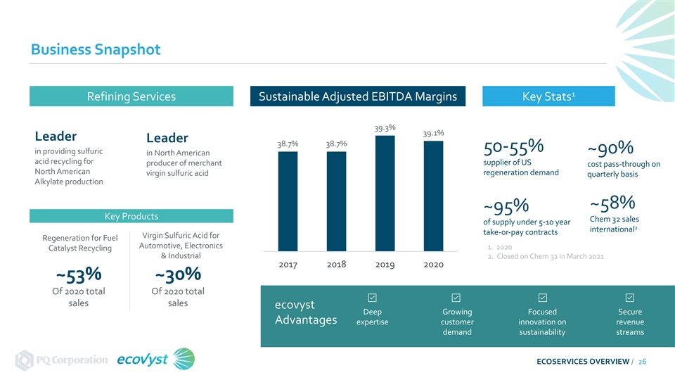 Where Do We Play? Markets and End Uses Served Industries Served Production Raw Materials Regenerated Refinery Spent Sulfuric Acid Sulfuric Acid Spent Sulfuric Acid Treatment Services Hazardous Waste MMBTUs from Haz Furnace General Industrial (Treatment Services) Waste & Sulfur Virgin acid Sulfur Nylon Mining Caustic Soda/ Scrubbers Ammonia Sulfur CoProducts SBS & ABS Agriculture Paper Alum Water Treatment Aluminum trihydrate Alum Cookers Chem32 Fresh Hydro- Refinery / Activated Catalyst processing catalyst Renewables ECOSERVICES OVERVIEW / 25 Raw Materials Production Refining Services ProductsWhere Do We Play? Markets and End Uses Served Industries Served Production Raw Materials Regenerated Refinery Spent Sulfuric Acid Sulfuric Acid Spent Sulfuric Acid Treatment Services Hazardous Waste MMBTUs from Haz Furnace General Industrial (Treatment Services) Waste & Sulfur Virgin acid Sulfur Nylon Mining Caustic Soda/ Scrubbers Ammonia Sulfur CoProducts SBS & ABS Agriculture Paper Alum Water Treatment Aluminum trihydrate Alum Cookers Chem32 Fresh Hydro- Refinery / Activated Catalyst processing catalyst Renewables ECOSERVICES OVERVIEW / 25 Raw Materials Production Refining Services Products