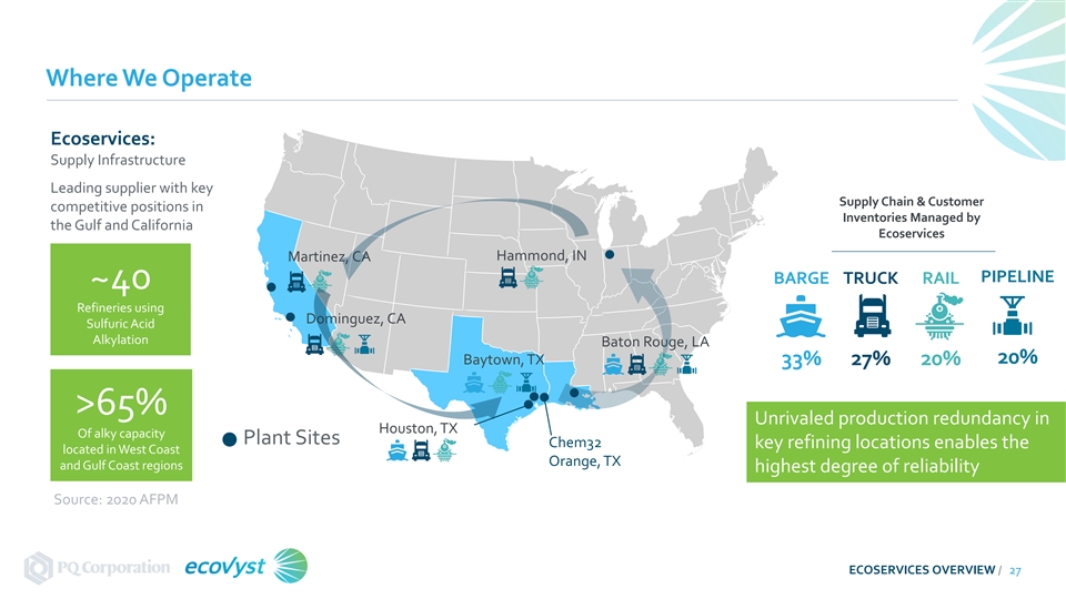 Where We Operate Ecoservices: Supply Infrastructure Leading supplier with key Supply Chain & Customer competitive positions in Inventories Managed by the Gulf and California Ecoservices Hammond, IN Martinez, CA PIPELINE BARGE TRUCK RAIL ~40 Refineries using Dominguez, CA Sulfuric Acid Alkylation Baton Rouge, LA 20% Baytown, TX 33% 27% 20% >65% Unrivaled production redundancy in Houston, TX Of alky capacity Plant Sites Chem32 key refining locations enables the located in West Coast Orange, TX and Gulf Coast regions highest degree of reliability Source: 2020 AFPM ECOSERVICES OVERVIEW / 27Where We Operate Ecoservices: Supply Infrastructure Leading supplier with key Supply Chain & Customer competitive positions in Inventories Managed by the Gulf and California Ecoservices Hammond, IN Martinez, CA PIPELINE BARGE TRUCK RAIL ~40 Refineries using Dominguez, CA Sulfuric Acid Alkylation Baton Rouge, LA 20% Baytown, TX 33% 27% 20% >65% Unrivaled production redundancy in Houston, TX Of alky capacity Plant Sites Chem32 key refining locations enables the located in West Coast Orange, TX and Gulf Coast regions highest degree of reliability Source: 2020 AFPM ECOSERVICES OVERVIEW / 27