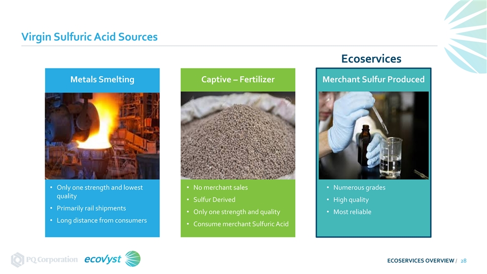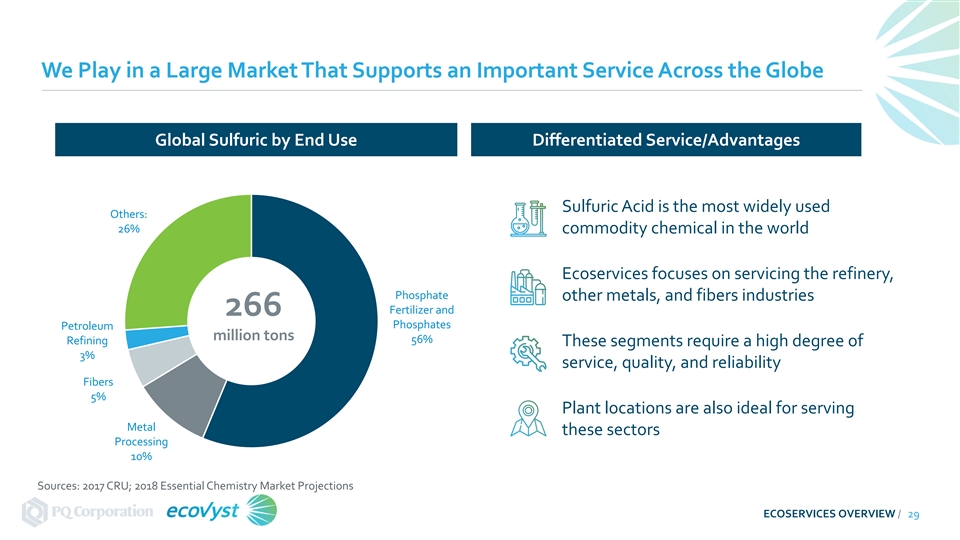 Virgin Sulfuric Acid Sources Ecoservices Metals Smelting Captive – Fertilizer Merchant Sulfur Produced • Only one strength and lowest • No merchant sales • Numerous grades quality • Sulfur Derived • High quality • Primarily rail shipments • Only one strength and quality • Most reliable • Long distance from consumers • Consume merchant Sulfuric Acid ECOSERVICES OVERVIEW / 28Virgin Sulfuric Acid Sources Ecoservices Metals Smelting Captive – Fertilizer Merchant Sulfur Produced • Only one strength and lowest • No merchant sales • Numerous grades quality • Sulfur Derived • High quality • Primarily rail shipments • Only one strength and quality • Most reliable • Long distance from consumers • Consume merchant Sulfuric Acid ECOSERVICES OVERVIEW / 28