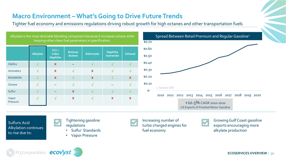 Macro Environment – What’s Going to Drive Future Trends Tighter fuel economy and emissions regulations driving robust growth for high octanes and other transportation fuels 1 Alkylate is the most desirable blending component because it increases octane while Spread Between Retail Premium and Regular Gasoline keeping other clean fuel parameters in specification. $0.70 $0.60 FCC / Butane/ Naphtha Alkylate Coker Reformate Ethanol Butene Isomerate $0.50 Naphtha $0.40 Olefins √ X -- √ √ √ $0.30 Aromatics √ X √ X √ √ $0.20 RON/MON √ X √ X √ X $0.10 Octane √ -- √ √ -- √ 1 Source: EIA $- Sulfur √ -- X √ √ √ 2010 2011 2012 2013 2014 2015 2016 2017 2018 2019 2020 Vapor √ √ X √ X X Pressure +10.5% CAGR 2010-2020 US Exports of Finished Motor Gasoline Tightening gasoline Increasing number of Growing Gulf Coast gasoline Sulfuric Acid regulations turbo charged engines for exports encouraging more Alkylation continues • Sulfur Standards fuel economy alkylate production to rise due to: • Vapor Pressure ECOSERVICES OVERVIEW / 30Macro Environment – What’s Going to Drive Future Trends Tighter fuel economy and emissions regulations driving robust growth for high octanes and other transportation fuels 1 Alkylate is the most desirable blending component because it increases octane while Spread Between Retail Premium and Regular Gasoline keeping other clean fuel parameters in specification. $0.70 $0.60 FCC / Butane/ Naphtha Alkylate Coker Reformate Ethanol Butene Isomerate $0.50 Naphtha $0.40 Olefins √ X -- √ √ √ $0.30 Aromatics √ X √ X √ √ $0.20 RON/MON √ X √ X √ X $0.10 Octane √ -- √ √ -- √ 1 Source: EIA $- Sulfur √ -- X √ √ √ 2010 2011 2012 2013 2014 2015 2016 2017 2018 2019 2020 Vapor √ √ X √ X X Pressure +10.5% CAGR 2010-2020 US Exports of Finished Motor Gasoline Tightening gasoline Increasing number of Growing Gulf Coast gasoline Sulfuric Acid regulations turbo charged engines for exports encouraging more Alkylation continues • Sulfur Standards fuel economy alkylate production to rise due to: • Vapor Pressure ECOSERVICES OVERVIEW / 30