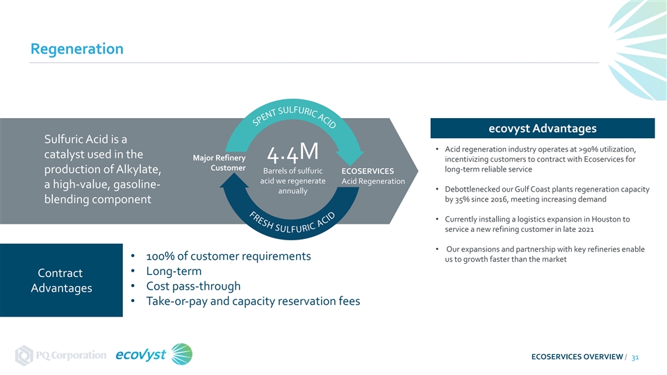 Regeneration ecovyst Advantages Sulfuric Acid is a • Acid regeneration industry operates at >90% utilization, catalyst used in the 4.4M Major Refinery incentivizing customers to contract with Ecoservices for Customer long-term reliable service production of Alkylate, Barrels of sulfuric ECOSERVICES acid we regenerate Acid Regeneration a high-value, gasoline- • Debottlenecked our Gulf Coast plants regeneration capacity annually by 35% since 2016, meeting increasing demand blending component • Currently installing a logistics expansion in Houston to service a new refining customer in late 2021 • Our expansions and partnership with key refineries enable • 100% of customer requirements us to growth faster than the market • Long-term Contract • Cost pass-through Advantages • Take-or-pay and capacity reservation fees ECOSERVICES OVERVIEW / 31Regeneration ecovyst Advantages Sulfuric Acid is a • Acid regeneration industry operates at >90% utilization, catalyst used in the 4.4M Major Refinery incentivizing customers to contract with Ecoservices for Customer long-term reliable service production of Alkylate, Barrels of sulfuric ECOSERVICES acid we regenerate Acid Regeneration a high-value, gasoline- • Debottlenecked our Gulf Coast plants regeneration capacity annually by 35% since 2016, meeting increasing demand blending component • Currently installing a logistics expansion in Houston to service a new refining customer in late 2021 • Our expansions and partnership with key refineries enable • 100% of customer requirements us to growth faster than the market • Long-term Contract • Cost pass-through Advantages • Take-or-pay and capacity reservation fees ECOSERVICES OVERVIEW / 31