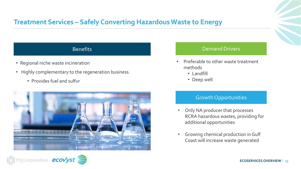 Virgin Acid – Differentiated by Strength, Quality and Reliability Sulfuric Acid Product Oleum High Strength Electrolyte Segment Nylon Mining Industrial End Use • Vehicle lightweighting • Electrification • Pet Chem and Chemical • Construction • Construction/Infrastructure • Lead Acid Batteries • Coatings and Packaging • Personal Devices • Water Treatment • Semiconductors High strength acid is used in mining High purity acid is used for Lead Acid Largest producer of Oleum, a super applications for copper leaching and Batteries, water treatment, and other ecovyst Advantages saturated sulfuric acid primarily used Borate production (electric vehicles, growing industrial segments including for Nylon production tech devices, and construction) pet chem and semiconductors ECOSERVICES OVERVIEW / 32Virgin Acid – Differentiated by Strength, Quality and Reliability Sulfuric Acid Product Oleum High Strength Electrolyte Segment Nylon Mining Industrial End Use • Vehicle lightweighting • Electrification • Pet Chem and Chemical • Construction • Construction/Infrastructure • Lead Acid Batteries • Coatings and Packaging • Personal Devices • Water Treatment • Semiconductors High strength acid is used in mining High purity acid is used for Lead Acid Largest producer of Oleum, a super applications for copper leaching and Batteries, water treatment, and other ecovyst Advantages saturated sulfuric acid primarily used Borate production (electric vehicles, growing industrial segments including for Nylon production tech devices, and construction) pet chem and semiconductors ECOSERVICES OVERVIEW / 32