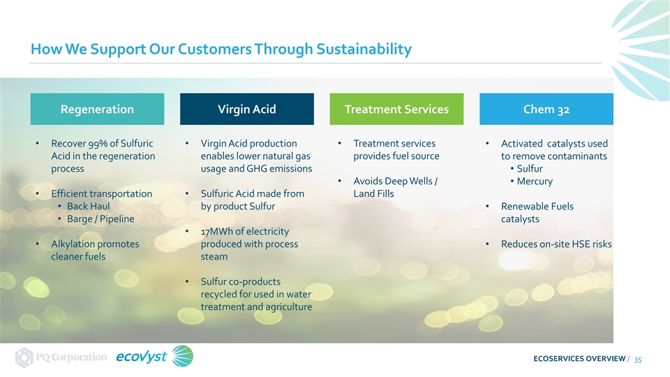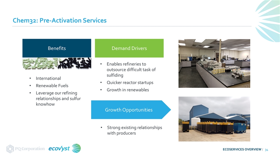 Chem32: Pre-Activation Services Benefits Demand Drivers • Enables refineries to outsource difficult task of sulfiding • International • Quicker reactor startups • Renewable Fuels • Growth in renewables • Leverage our refining relationships and sulfur knowhow Growth Opportunities • Strong existing relationships with producers ECOSERVICES OVERVIEW / 34Chem32: Pre-Activation Services Benefits Demand Drivers • Enables refineries to outsource difficult task of sulfiding • International • Quicker reactor startups • Renewable Fuels • Growth in renewables • Leverage our refining relationships and sulfur knowhow Growth Opportunities • Strong existing relationships with producers ECOSERVICES OVERVIEW / 34