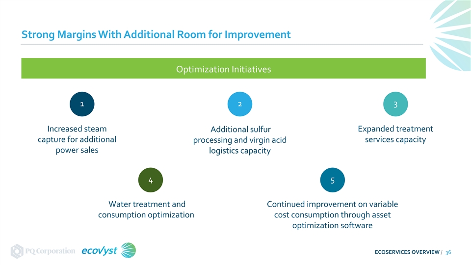 Strong Margins With Additional Room for Improvement Optimization Initiatives 1 2 3 Increased steam Expanded treatment Additional sulfur capture for additional services capacity processing and virgin acid power sales logistics capacity 4 5 Water treatment and Continued improvement on variable consumption optimization cost consumption through asset optimization software ECOSERVICES OVERVIEW / 36Strong Margins With Additional Room for Improvement Optimization Initiatives 1 2 3 Increased steam Expanded treatment Additional sulfur capture for additional services capacity processing and virgin acid power sales logistics capacity 4 5 Water treatment and Continued improvement on variable consumption optimization cost consumption through asset optimization software ECOSERVICES OVERVIEW / 36