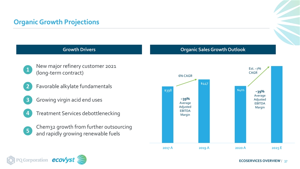 Organic Growth Projections Growth Drivers Organic Sales Growth Outlook New major refinery customer 2021 Est. ~7% 1 CAGR (long-term contract) 6% CAGR $447 2 Favorable alkylate fundamentals $401 $398 ~39% Average ~39% Adjusted 3 Growing virgin acid end uses Average EBITDA Adjusted Margin EBITDA 4 Treatment Services debottlenecking Margin Chem32 growth from further outsourcing 5 and rapidly growing renewable fuels 2017 A 2019 A 2020 A 2025 E ECOSERVICES OVERVIEW / 37Organic Growth Projections Growth Drivers Organic Sales Growth Outlook New major refinery customer 2021 Est. ~7% 1 CAGR (long-term contract) 6% CAGR $447 2 Favorable alkylate fundamentals $401 $398 ~39% Average ~39% Adjusted 3 Growing virgin acid end uses Average EBITDA Adjusted Margin EBITDA 4 Treatment Services debottlenecking Margin Chem32 growth from further outsourcing 5 and rapidly growing renewable fuels 2017 A 2019 A 2020 A 2025 E ECOSERVICES OVERVIEW / 37