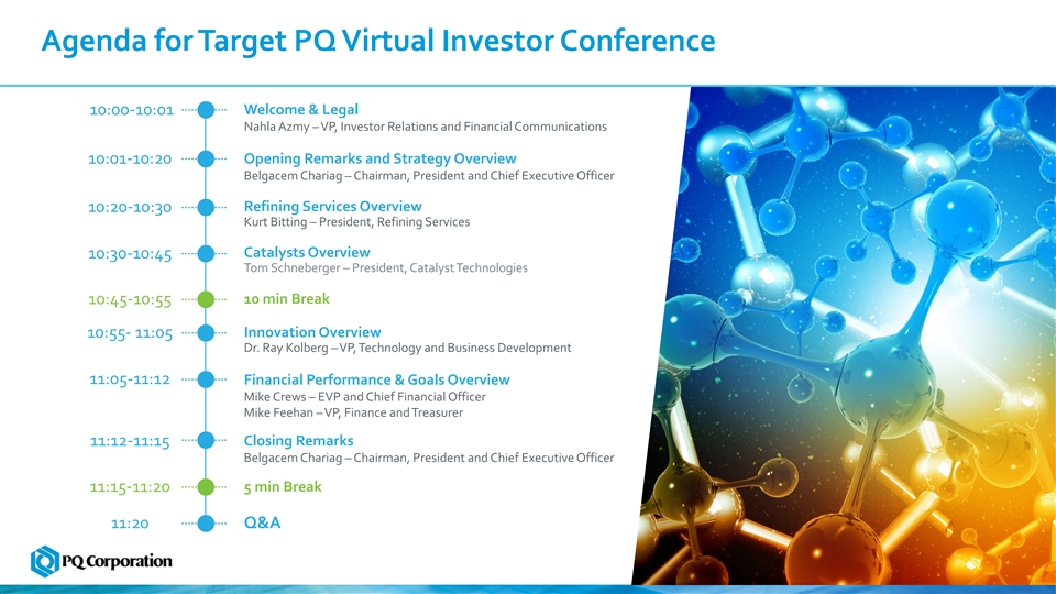 Agenda for Target PQ Virtual Investor Conference 10:00-10:01 Welcome & Legal Nahla Azmy – VP, Investor Relations and Financial Communications 10:01-10:20 Opening Remarks and Strategy Overview Belgacem Chariag – Chairman, President and Chief Executive Officer Refining Services Overview 10:20-10:30 Kurt Bitting – President, Refining Services Catalysts Overview 10:30-10:45 Tom Schneberger – President, Catalyst Technologies 10:45-10:55 10 min Break Innovation Overview 10:55- 11:05 Dr. Ray Kolberg – VP, Technology and Business Development 11:05-11:12 Financial Performance & Goals Overview Mike Crews – EVP and Chief Financial Officer Mike Feehan – VP, Finance and Treasurer 11:12-11:15 Closing Remarks Belgacem Chariag – Chairman, President and Chief Executive Officer 11:15-11:20 5 min Break 11:20 Q&A Agenda for Target PQ Virtual Investor Conference 10:00-10:01 Welcome & Legal Nahla Azmy – VP, Investor Relations and Financial Communications 10:01-10:20 Opening Remarks and Strategy Overview Belgacem Chariag – Chairman, President and Chief Executive Officer Refining Services Overview 10:20-10:30 Kurt Bitting – President, Refining Services Catalysts Overview 10:30-10:45 Tom Schneberger – President, Catalyst Technologies 10:45-10:55 10 min Break Innovation Overview 10:55- 11:05 Dr. Ray Kolberg – VP, Technology and Business Development 11:05-11:12 Financial Performance & Goals Overview Mike Crews – EVP and Chief Financial Officer Mike Feehan – VP, Finance and Treasurer 11:12-11:15 Closing Remarks Belgacem Chariag – Chairman, President and Chief Executive Officer 11:15-11:20 5 min Break 11:20 Q&A