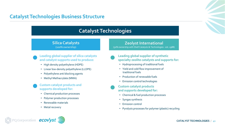 Catalyst Technologies Business Structure Catalyst Technologies Silica Catalysts Zeolyst International (50% ownership with Shell Catalysts & Technologies - est. 1988) (100% ownership) Leading global supplier of silica catalysts Leading global supplier of synthetic and catalyst supports used to produce: specialty zeolite catalysts and supports for: • Hydroprocessing of traditional fuels • High density polyethylene (HDPE) • Yield and cold flow improvement of • Linear low-density polyethylene (LLDPE) traditional fuels • Polyethylene anti blocking agents • Production of renewable fuels • Methyl Methacrylate (MMA) • Emission control technologies Custom catalyst products and Custom catalyst products supports developed for: and supports developed for: • Chemical production processes • Chemical & fuel production processes • Polymer production processes • Syngas synthesis • Renewable materials • Emission control • Metal recovery • Pyrolysis processes for polymer (plastic) recycling CATALYST TECHNOLOGIES / 41Catalyst Technologies Business Structure Catalyst Technologies Silica Catalysts Zeolyst International (50% ownership with Shell Catalysts & Technologies - est. 1988) (100% ownership) Leading global supplier of silica catalysts Leading global supplier of synthetic and catalyst supports used to produce: specialty zeolite catalysts and supports for: • Hydroprocessing of traditional fuels • High density polyethylene (HDPE) • Yield and cold flow improvement of • Linear low-density polyethylene (LLDPE) traditional fuels • Polyethylene anti blocking agents • Production of renewable fuels • Methyl Methacrylate (MMA) • Emission control technologies Custom catalyst products and Custom catalyst products supports developed for: and supports developed for: • Chemical production processes • Chemical & fuel production processes • Polymer production processes • Syngas synthesis • Renewable materials • Emission control • Metal recovery • Pyrolysis processes for polymer (plastic) recycling CATALYST TECHNOLOGIES / 41
