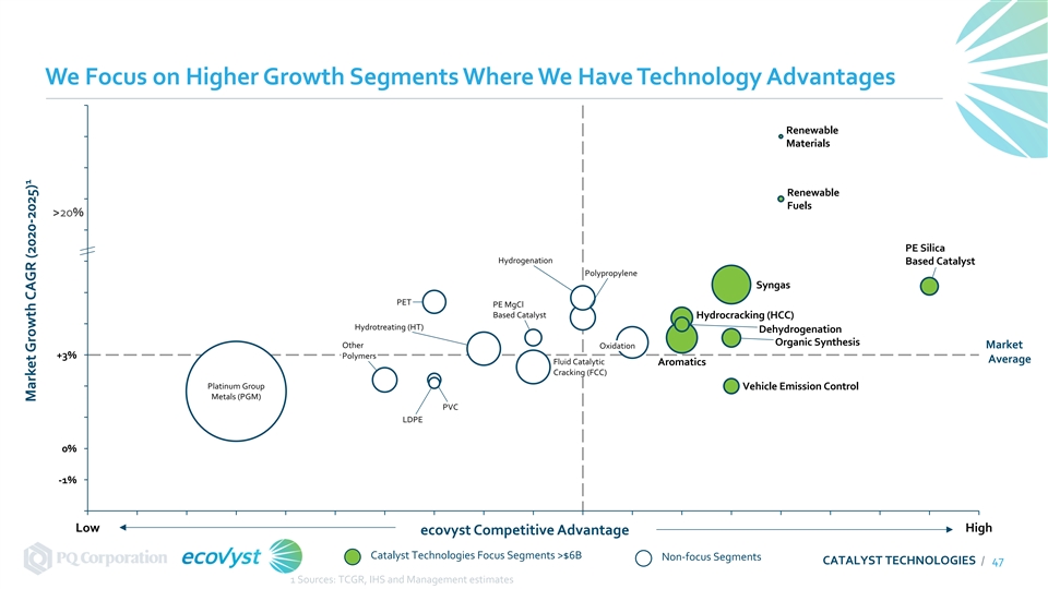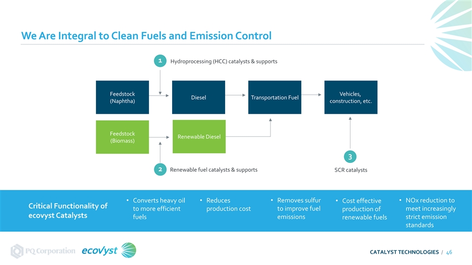 We Are Integral to Clean Fuels and Emission Control 1 Hydroprocessing (HCC) catalysts & supports Feedstock Vehicles, Diesel Transportation Fuel (Naphtha) construction, etc. Feedstock Renewable Diesel (Biomass) 3 2 Renewable fuel catalysts & supports SCR catalysts • Converts heavy oil • Reduces • Removes sulfur • NOx reduction to • Cost effective Critical Functionality of to improve fuel meet increasingly to more efficient production cost production of ecovyst Catalysts fuels emissions strict emission renewable fuels standards CATALYST TECHNOLOGIES / 46We Are Integral to Clean Fuels and Emission Control 1 Hydroprocessing (HCC) catalysts & supports Feedstock Vehicles, Diesel Transportation Fuel (Naphtha) construction, etc. Feedstock Renewable Diesel (Biomass) 3 2 Renewable fuel catalysts & supports SCR catalysts • Converts heavy oil • Reduces • Removes sulfur • NOx reduction to • Cost effective Critical Functionality of to improve fuel meet increasingly to more efficient production cost production of ecovyst Catalysts fuels emissions strict emission renewable fuels standards CATALYST TECHNOLOGIES / 46