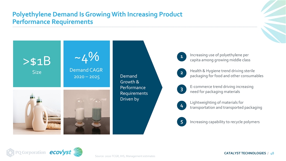 Polyethylene Demand Is Growing With Increasing Product Performance Requirements Increasing use of polyethylene per 1 ~4% capita among growing middle class >$1B Demand CAGR Health & Hygiene trend driving sterile Size 2 packaging for food and other consumables Demand 2020 – 2025 Growth & E-commerce trend driving increasing Performance 3 need for packaging materials Requirements Driven by Lightweighting of materials for 4 transportation and transported packaging 5 Increasing capability to recycle polymers CATALYST TECHNOLOGIES / 48 Source: 2020 TCGR, IHS, Management estimatesPolyethylene Demand Is Growing With Increasing Product Performance Requirements Increasing use of polyethylene per 1 ~4% capita among growing middle class >$1B Demand CAGR Health & Hygiene trend driving sterile Size 2 packaging for food and other consumables Demand 2020 – 2025 Growth & E-commerce trend driving increasing Performance 3 need for packaging materials Requirements Driven by Lightweighting of materials for 4 transportation and transported packaging 5 Increasing capability to recycle polymers CATALYST TECHNOLOGIES / 48 Source: 2020 TCGR, IHS, Management estimates